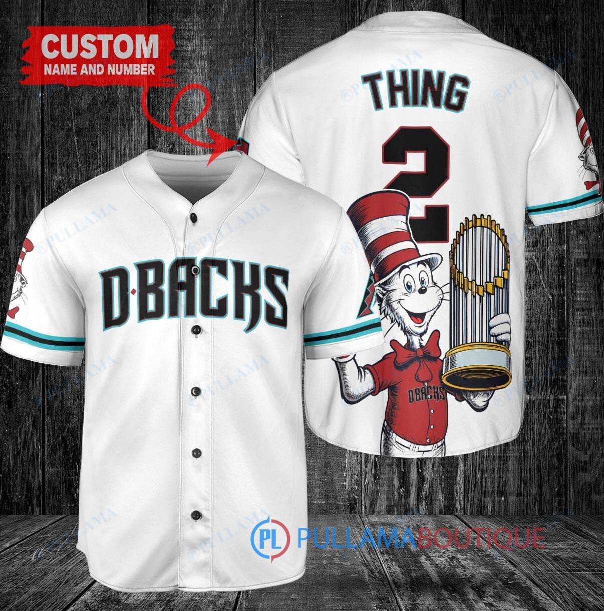 Show your support for the Arizona Diamondbacks in a fun and whimsical way with this Dr. Seuss World Series Trophy Baseball Jersey. This white jersey features a unique design inspired by Dr. Seuss, making it a standout piece for any Diamondbacks fan. Perfect for wearing to games or just showing off your team pride, this jersey is a must-have for any baseball enthusiast.