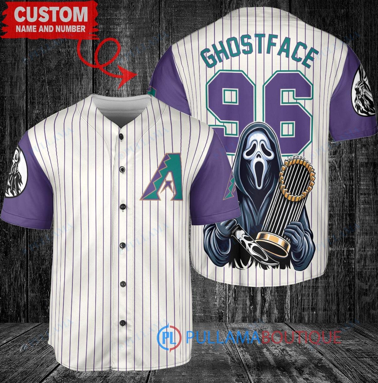 Get ready for Halloween with this Arizona Diamondbacks Ghostface Scream World Series Trophy Baseball Jersey. This unique jersey features a spooky Ghostface design inspired by the iconic horror movie, perfect for adding a festive touch to your baseball game outfit. Made with high-quality materials, this jersey is comfortable to wear and durable for long-lasting use. Show off your team spirit in a fun and eerie way with this Halloween-themed baseball jersey.