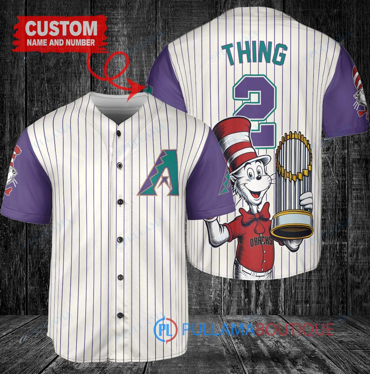 Show off your love for the Arizona Diamondbacks in a fun and whimsical way with this custom baseball jersey featuring a Dr. Seuss design. The cream and purple colors add a unique touch to this jersey, while the World Series Trophy graphic adds a touch of championship flair. Perfect for any Diamondbacks fan looking to stand out in the crowd.