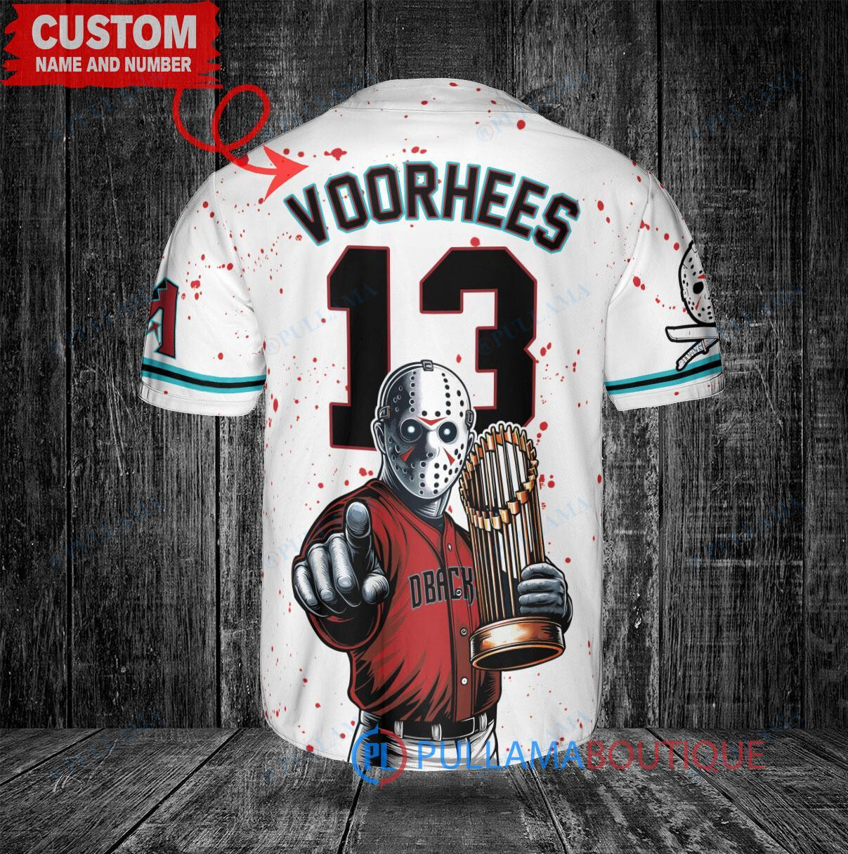 Get ready for Halloween with this custom Arizona Diamondbacks x Friday the 13th Jason Voorhees Baseball Jersey! This unique white jersey features a spooky design with Jason Voorhees and the World Series Trophy, perfect for any baseball fan looking to celebrate the holiday in style. Made with high-quality materials, this jersey is sure to be a hit at any Halloween party or baseball game. Add a touch of horror to your wardrobe with this one-of-a-kind jersey!