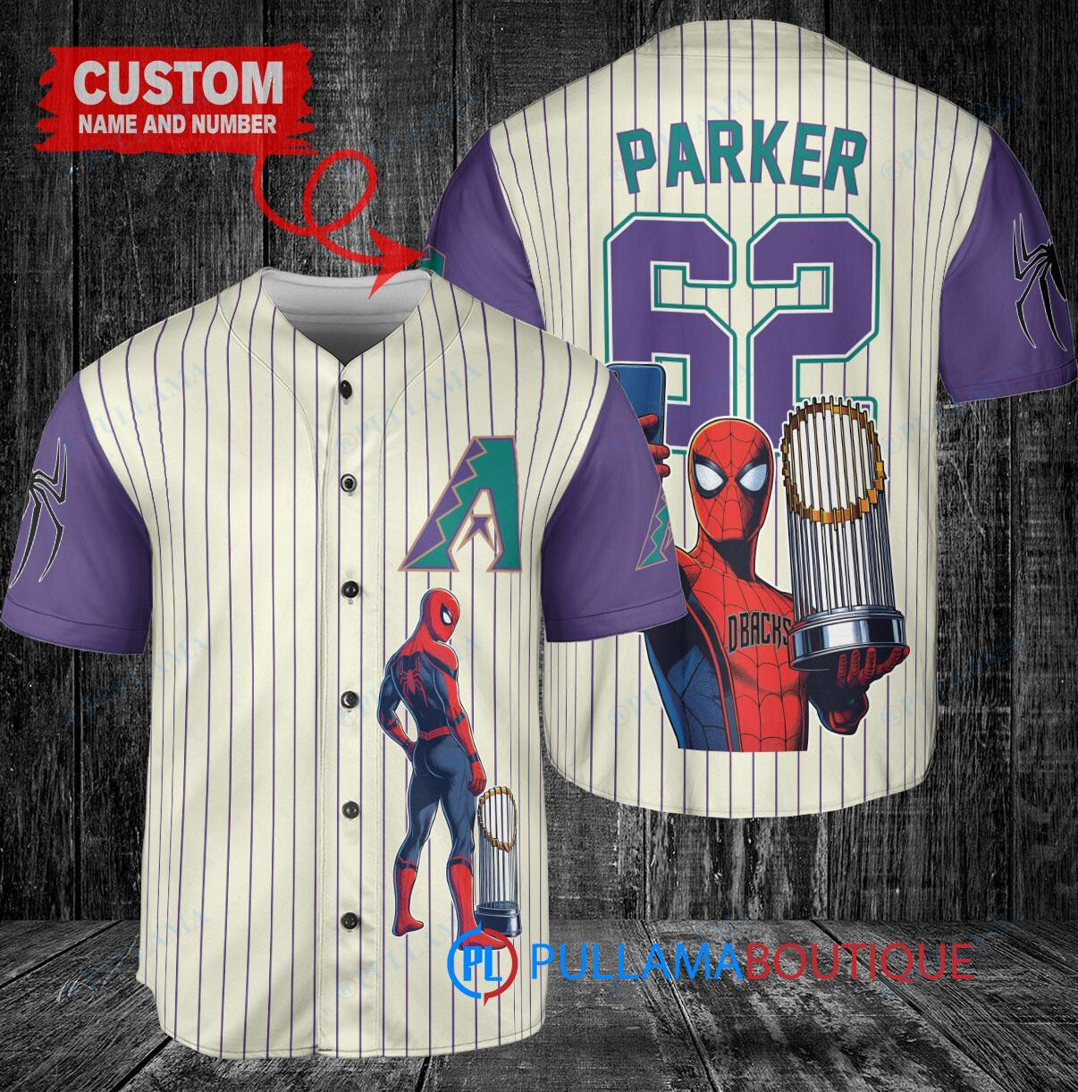 Arizona Diamondbacks x Marvel Spiderman with Trophy Custom Baseball Jersey Cream-Purple