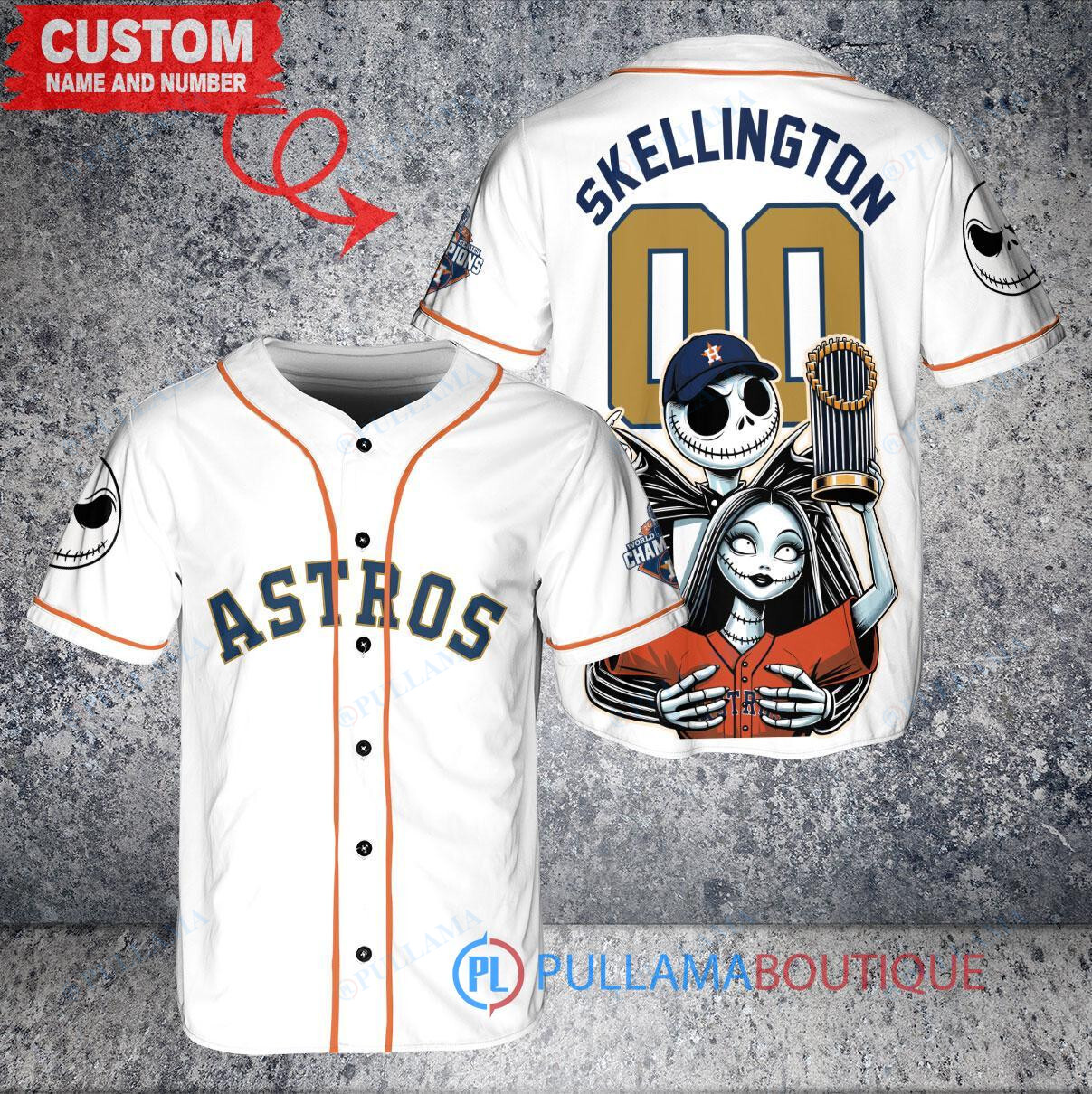Show your love for the Houston Astros and celebrate their World Series victory with this unique Jack Skellington and Sally themed baseball jersey. The jersey features a white design with the Astros logo and World Series trophy, perfect for any Astros fan looking to stand out in the crowd. Made with high-quality materials, this jersey is a must-have for any baseball enthusiast.