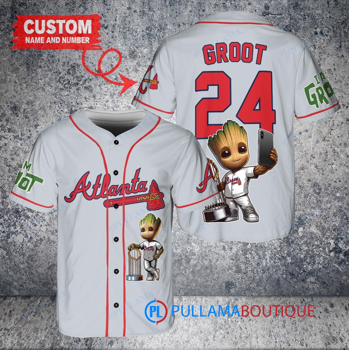 Atlanta Braves x Baby Groot Marvel Guardians Of The Galaxy with Trophy Custom Baseball Jersey Gray