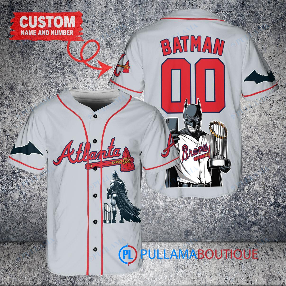 Atlanta Braves x DC Comics Batman The Dark Knight with Trophy Custom Baseball Jersey Gray