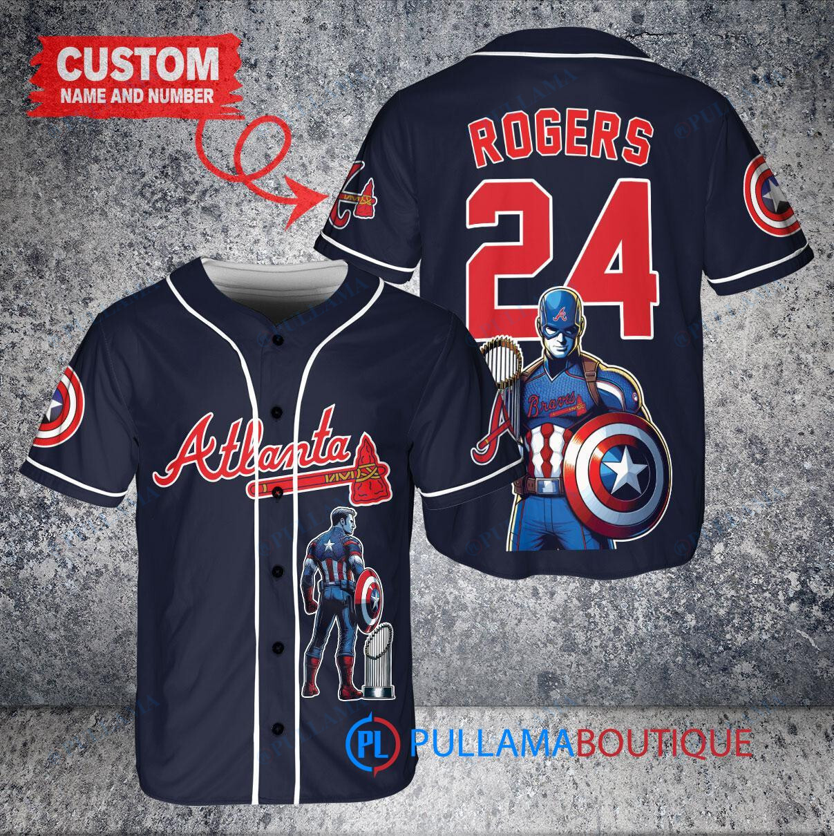 Show your support for the Atlanta Braves with this custom baseball jersey featuring Marvel’s Captain America Steve Rogers design. The navy jersey is adorned with the Braves logo and comes with a trophy design, perfect for any fan of the team and the iconic superhero. Made with high-quality materials, this jersey is a must-have for any baseball enthusiast.