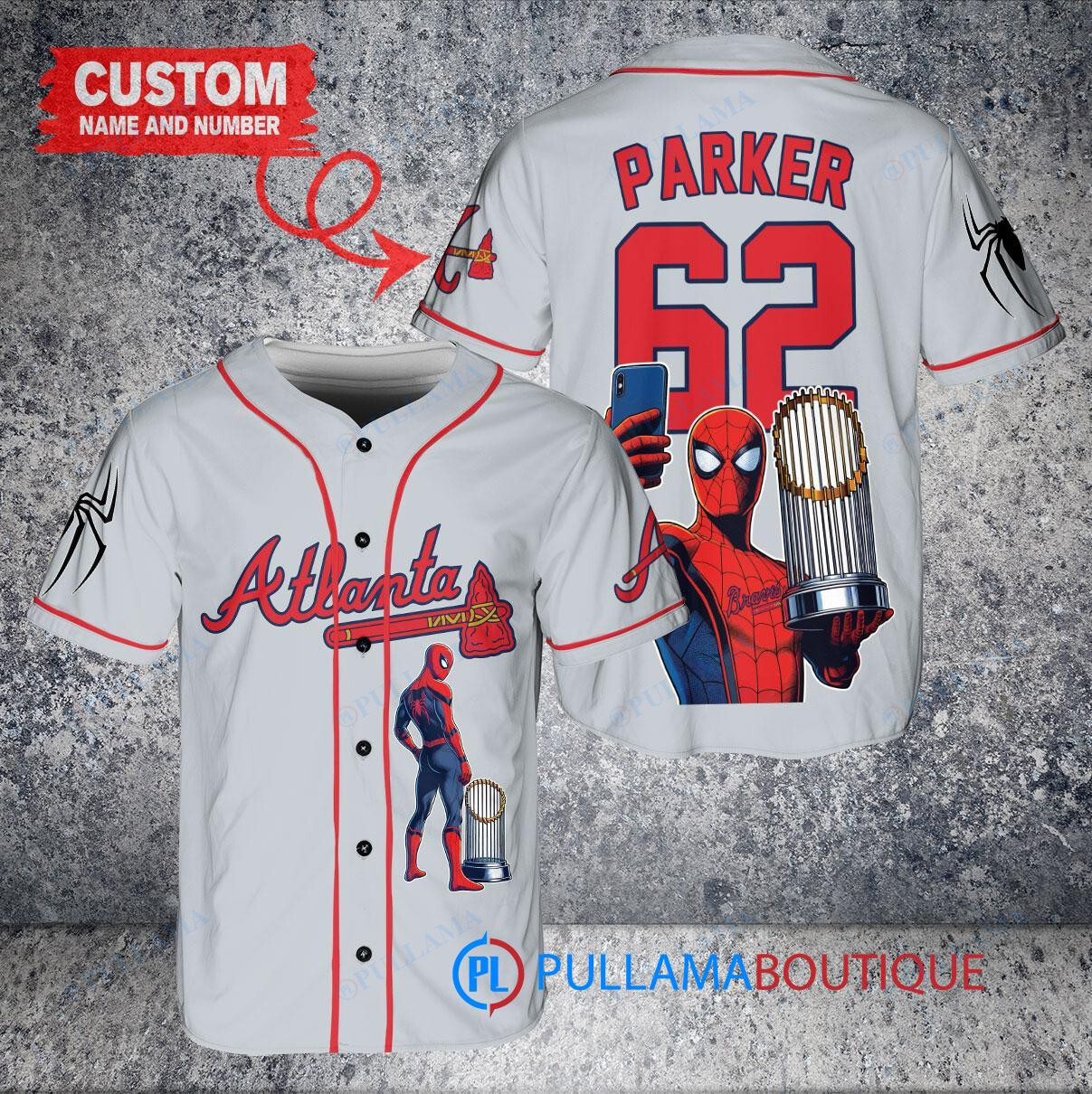 Show off your love for the Atlanta Braves and Marvel with this custom baseball jersey featuring Spiderman holding a trophy. The gray jersey is perfect for any fan looking to stand out in the crowd. Made with high-quality materials, this jersey is a must-have for any baseball enthusiast.