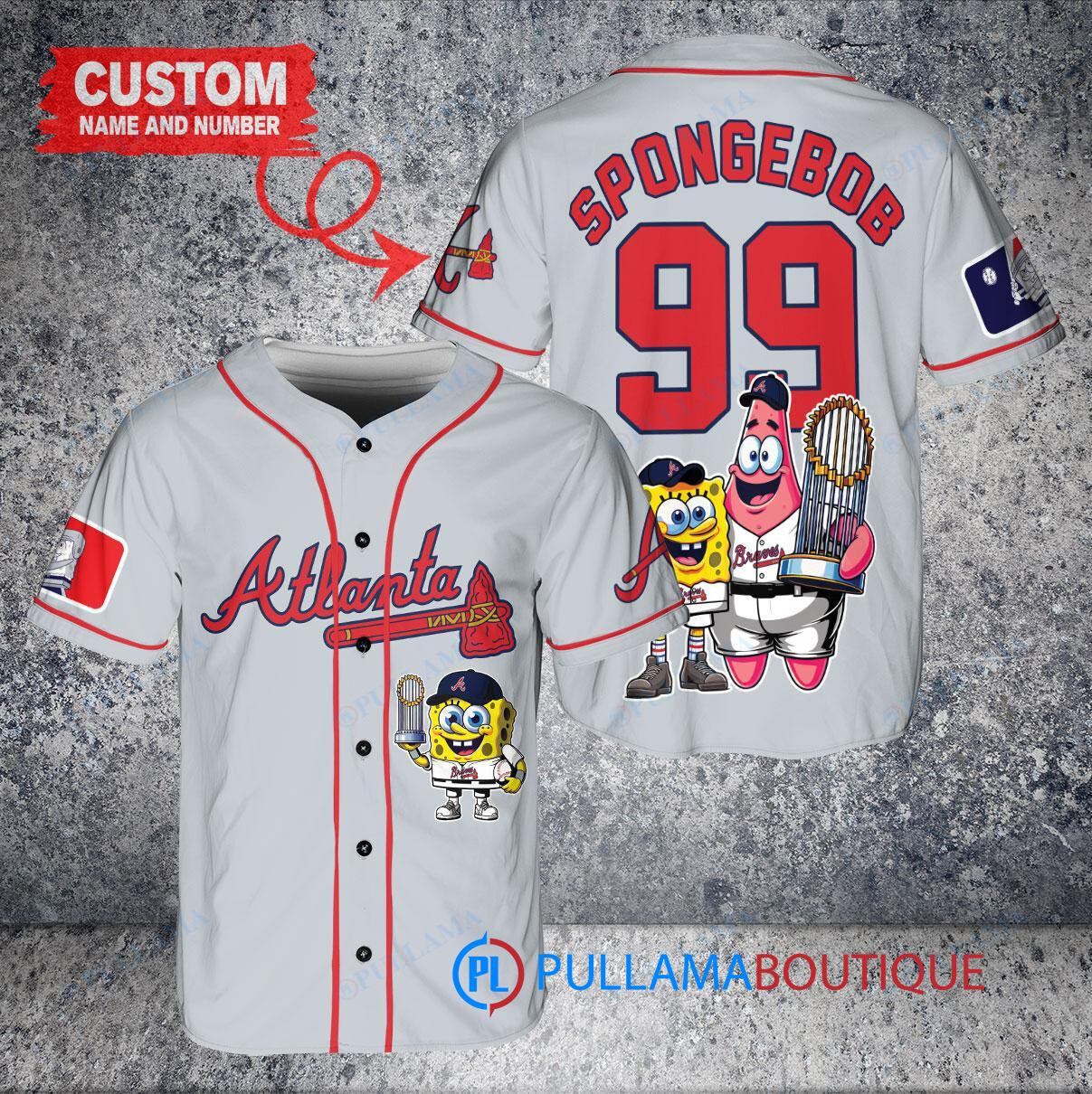 Show off your love for the Atlanta Braves and SpongeBob SquarePants with this custom baseball jersey in gray. Featuring a unique design of both iconic logos and a trophy graphic, this jersey is perfect for any fan looking to stand out in the crowd. Made with high-quality materials, this jersey is comfortable to wear while cheering on your favorite team. Get ready to hit a home run in style with this Atlanta Braves x SpongeBob SquarePants custom baseball jersey.