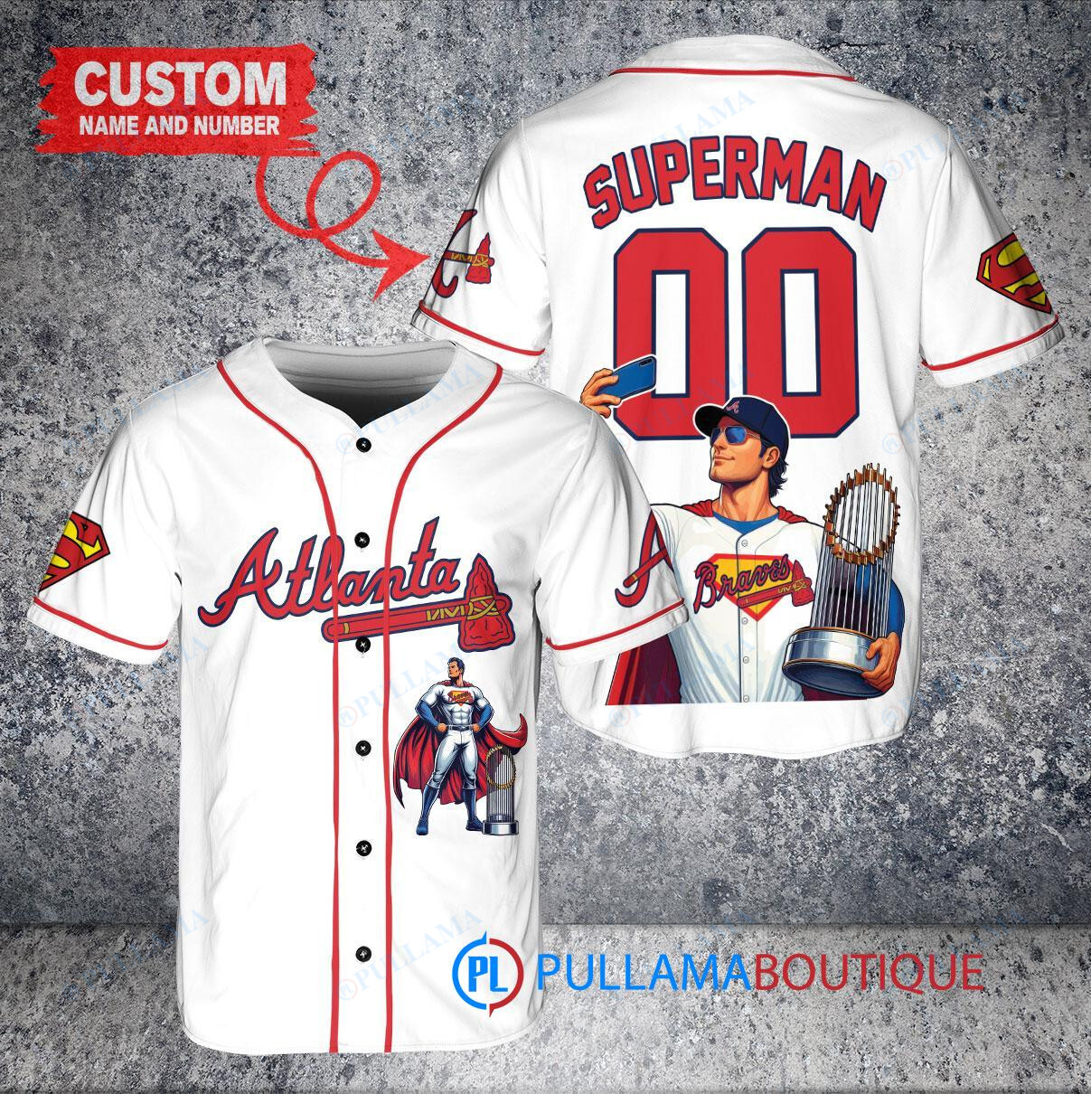 Atlanta Braves x Superman DC Comics with Trophy Custom Baseball Jersey White