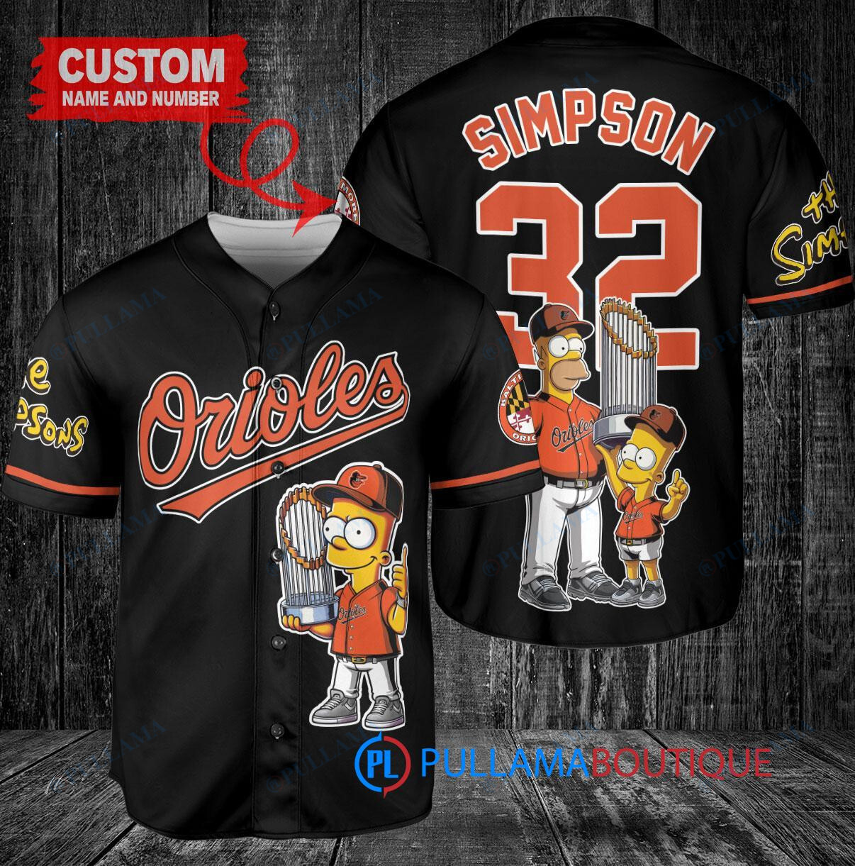 Show off your love for the Baltimore Orioles and The Simpsons with this custom baseball jersey featuring Bart Simpson, Homer Simpson, and Lisa Simpson holding a trophy. The jersey is designed in black with vibrant colors, making it a fun and unique addition to your sports apparel collection. Perfect for any fan looking to stand out in the crowd, this jersey is sure to be a hit at the next game or event. Get yours today and show your support in style!