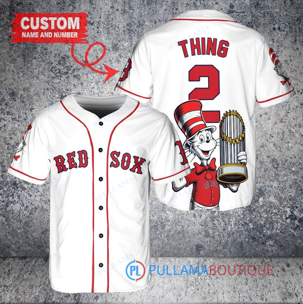 Show off your love for the Boston Red Sox and Dr. Seuss with this custom baseball jersey featuring the World Series Trophy. This white jersey is perfect for any Red Sox fan looking to stand out in the crowd. Made with high-quality materials, this jersey is both stylish and comfortable. Get yours today and cheer on your favorite team in style!