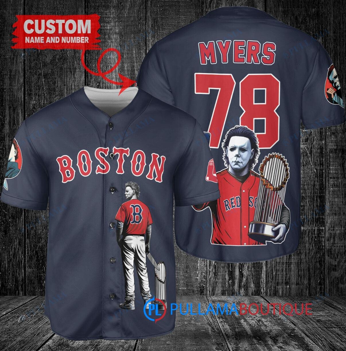 Get into the Halloween spirit with this custom Boston Red Sox baseball jersey featuring Michael Myers holding a trophy. The navy jersey is perfect for any Red Sox fan looking to add a spooky twist to their game day outfit. Made with high-quality materials, this jersey is sure to be a hit at any Halloween party or baseball game. Add a touch of horror to your wardrobe with this unique and eye-catching jersey.