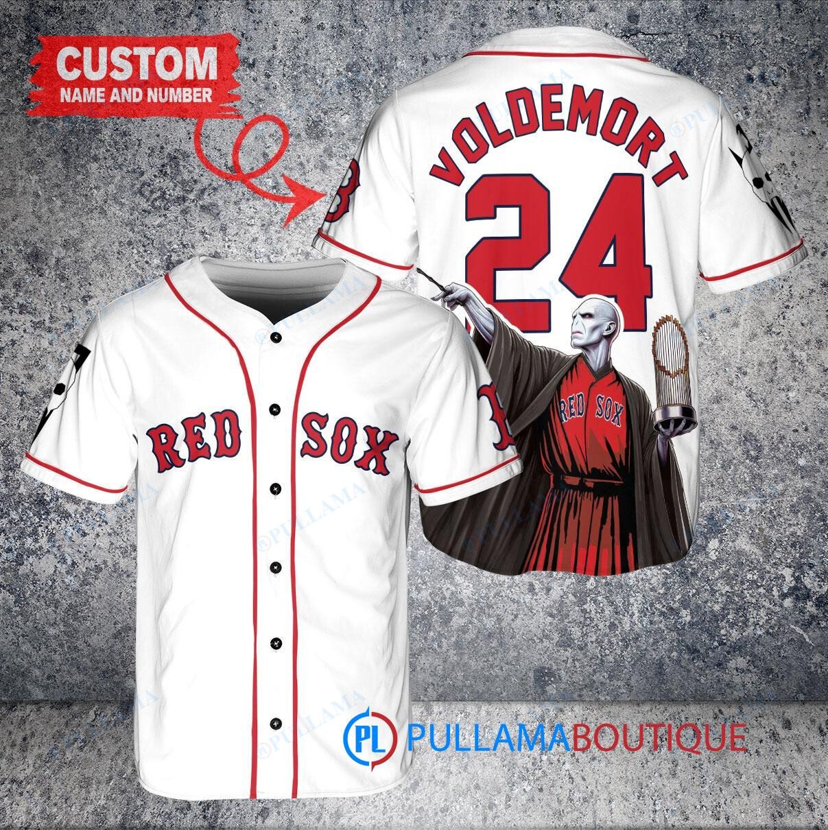 Show off your love for both the Boston Red Sox and Harry Potter with this custom baseball jersey featuring Lord Voldemort. This white jersey is perfect for any fan looking to stand out in the crowd. Made with high-quality materials, this jersey is a must-have for any collector or fan of the wizarding world. Get your hands on this unique piece and show your support for your favorite team and magical universe.