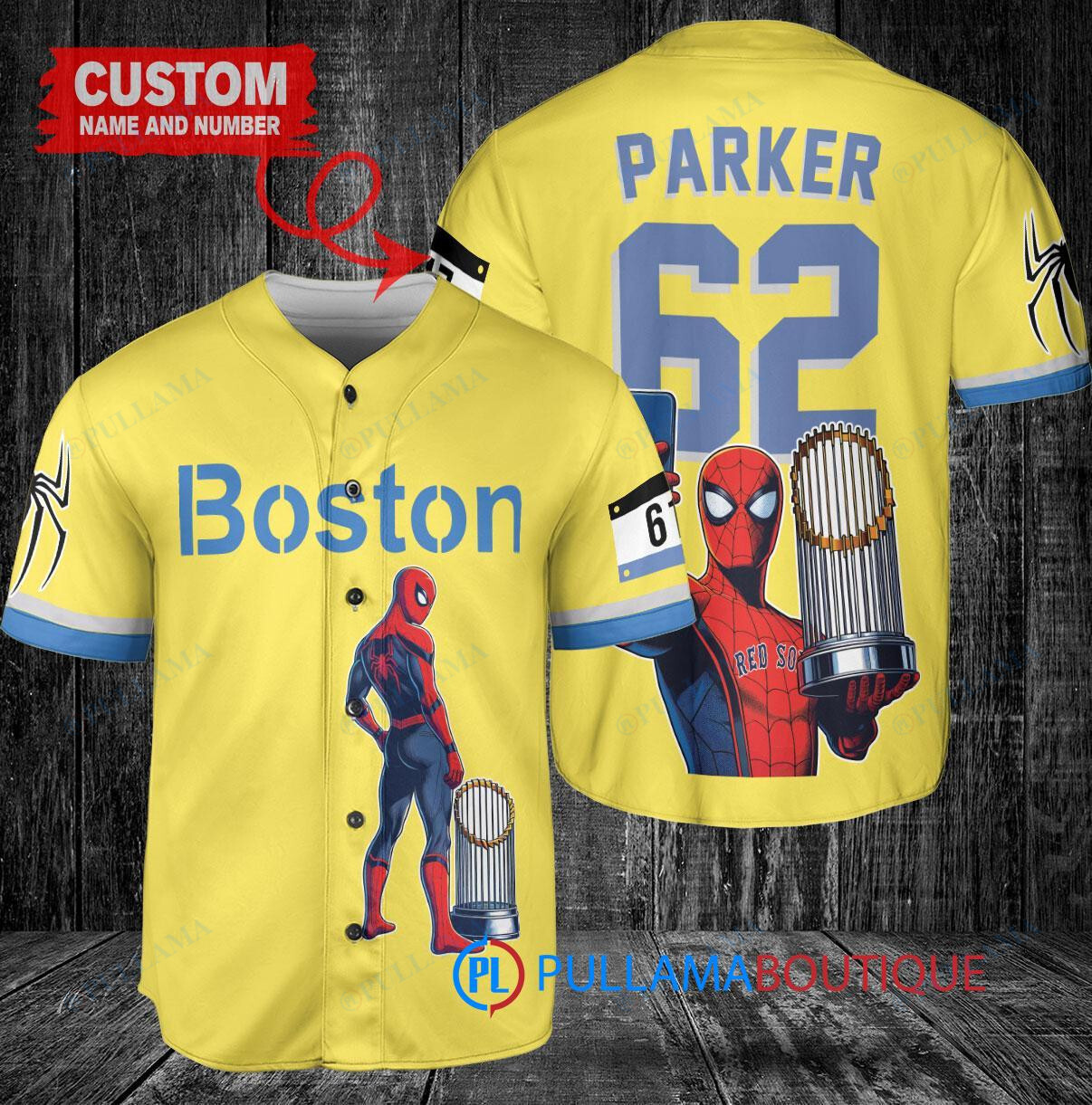 Boston Red Sox x Marvel Spiderman with Trophy Custom Baseball Jersey Gold-Light Blue City Connect