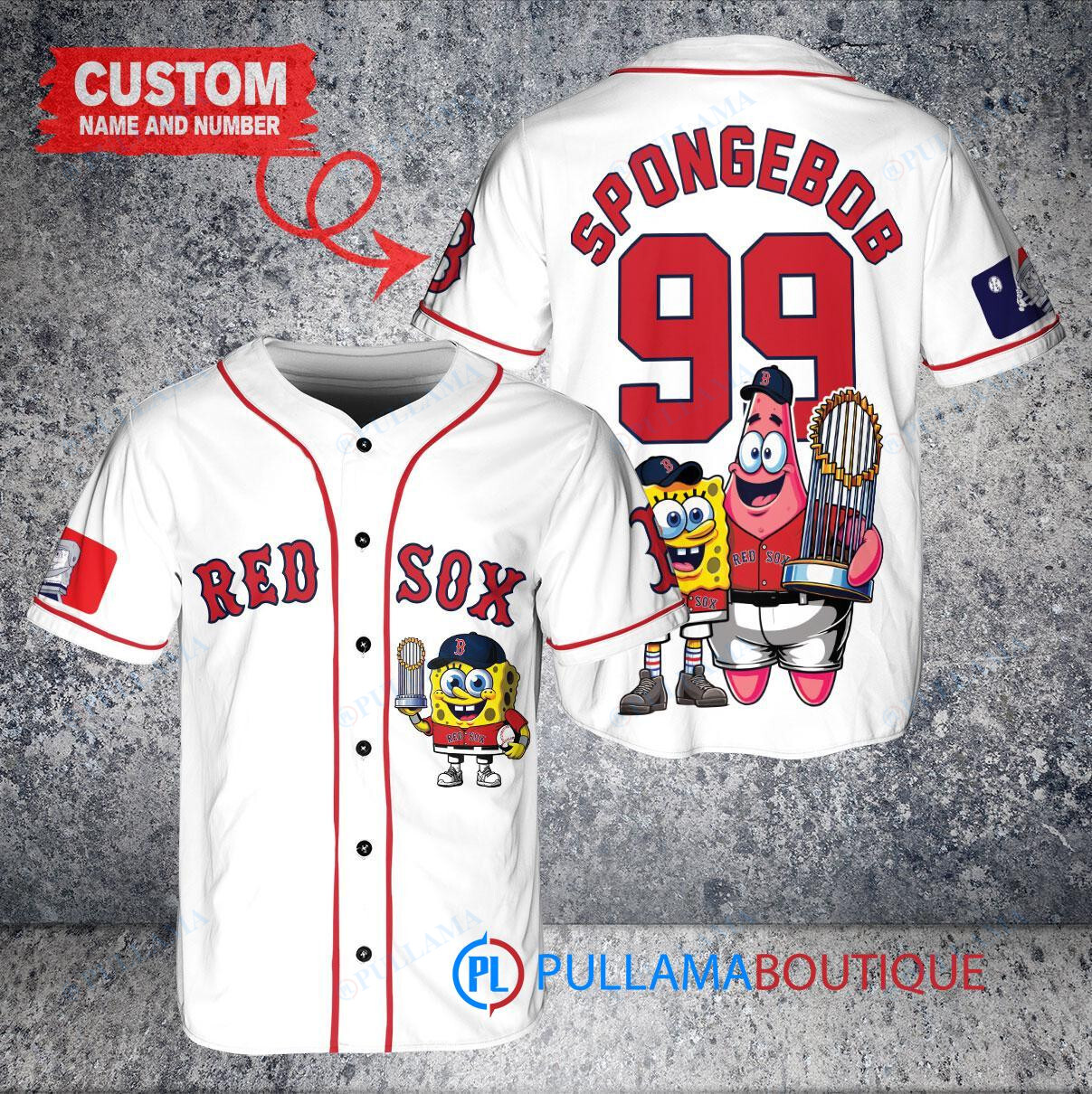 Show off your love for the Boston Red Sox and SpongeBob SquarePants with this custom baseball jersey featuring a trophy design. This white jersey is perfect for any fan looking to stand out in the crowd. Made with high-quality materials, this jersey is comfortable to wear while cheering on your favorite team. Get ready to hit a home run in style with this unique and eye-catching baseball jersey.
