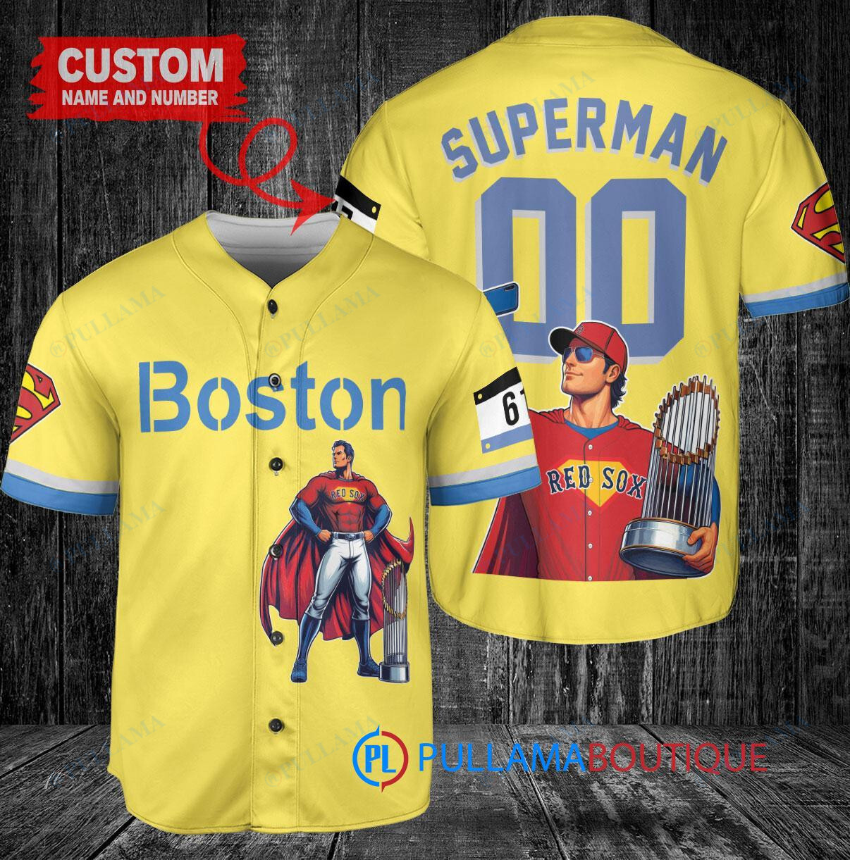 Show off your love for the Boston Red Sox and Superman with this custom baseball jersey featuring a unique Gold-Light Blue City Connect design. Made in collaboration with DC Comics, this jersey is perfect for any fan looking to stand out in the crowd. The jersey also features a trophy design, adding an extra touch of style. Get ready to hit a home run in style with this one-of-a-kind baseball jersey!