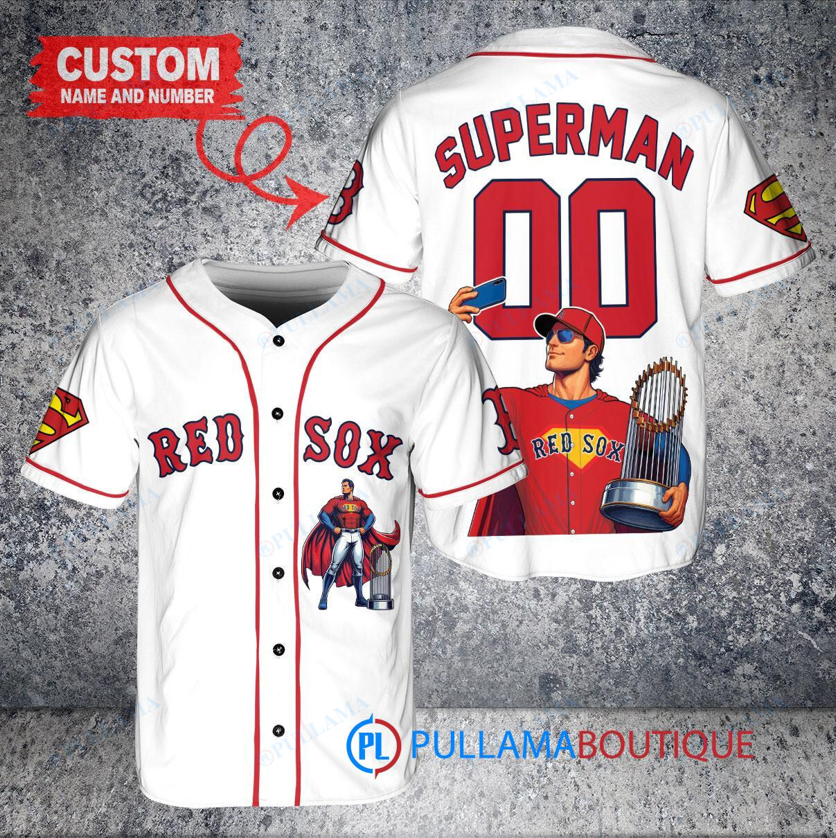 Show off your love for the Boston Red Sox and Superman with this custom baseball jersey featuring a unique DC Comics design. The white jersey is accented with the iconic Superman logo and comes with a trophy design, perfect for any fan looking to stand out in the crowd. Made with high-quality materials, this jersey is a must-have for any baseball enthusiast.