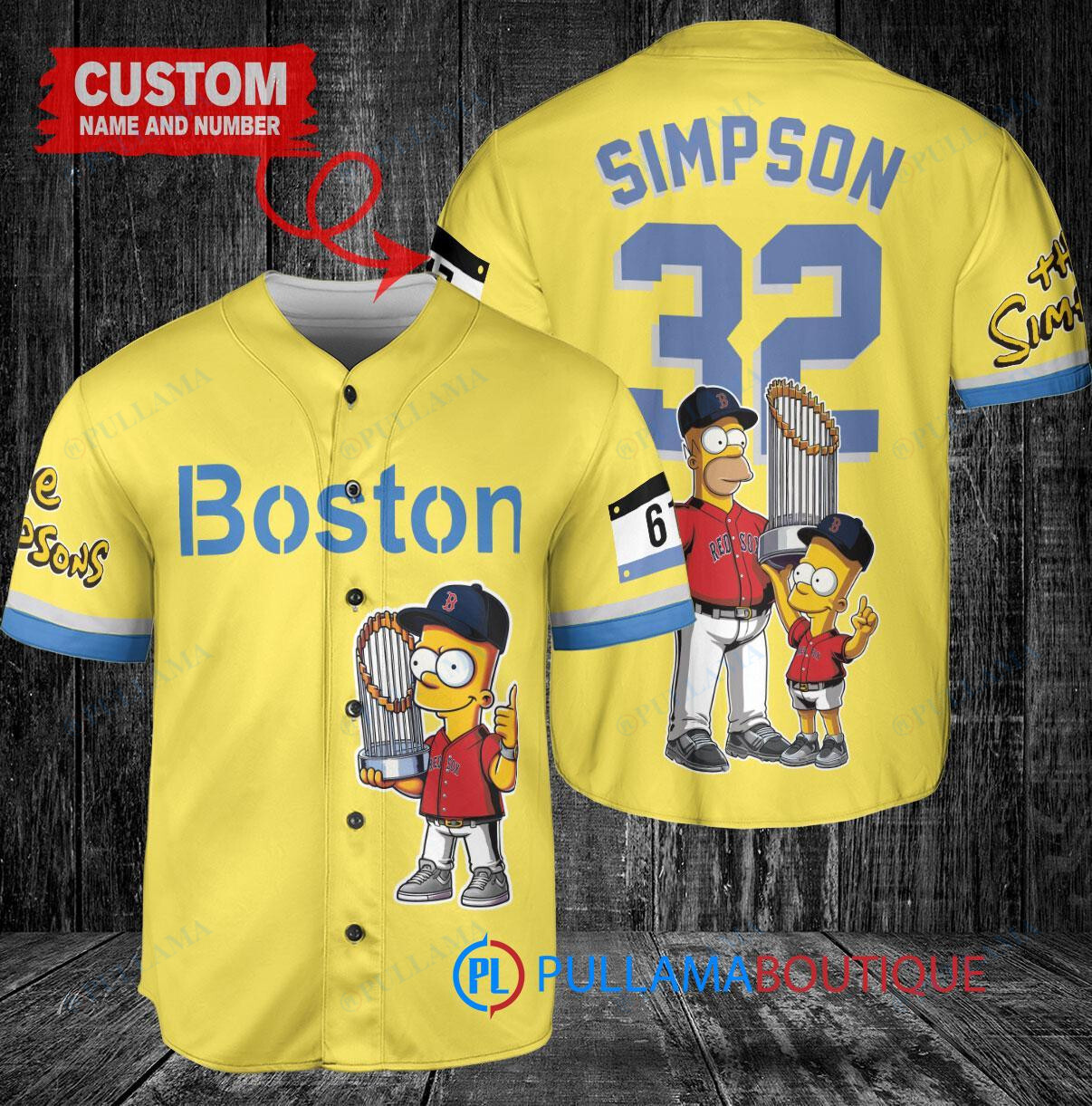 Show off your love for the Boston Red Sox and The Simpsons with this custom baseball jersey featuring Bart Simpson, Homer Simpson, and Lisa Simpson holding a trophy. The jersey is designed in a gold and light blue City Connect color scheme, perfect for standing out in the crowd. Made with high-quality materials, this jersey is a must-have for any fan looking to add a unique piece to their collection.