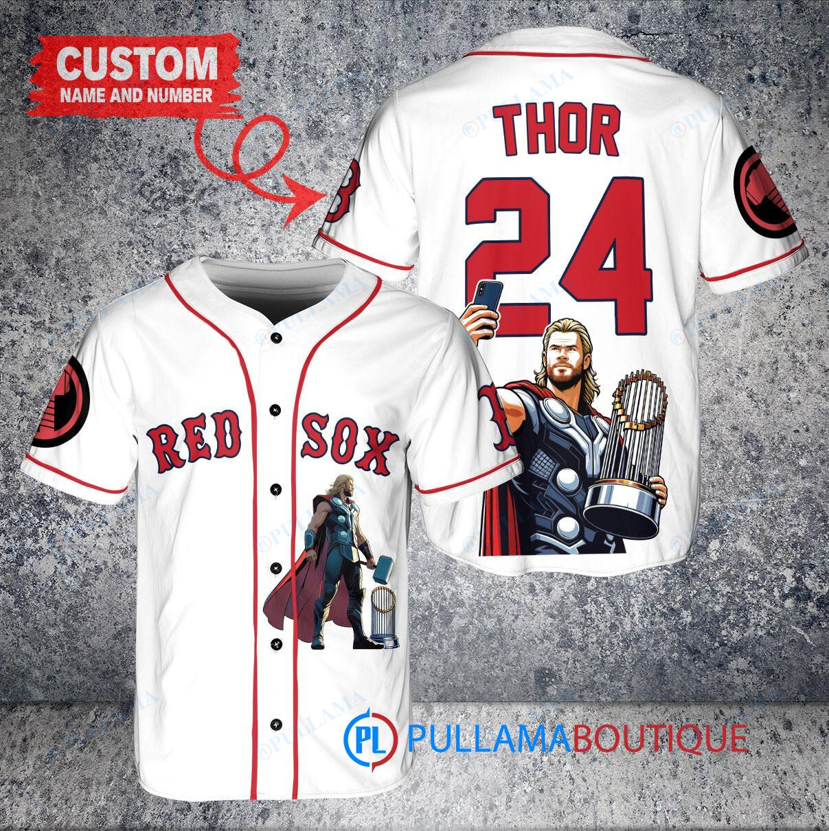 Show off your love for the Boston Red Sox and Thor with this custom baseball jersey featuring a unique design of the iconic Marvel character holding a trophy. This white jersey is perfect for any Red Sox fan looking to stand out in the crowd. Made with high-quality materials, this jersey is both stylish and comfortable, making it a great addition to any fan’s collection. Get yours today and hit a home run with your style!