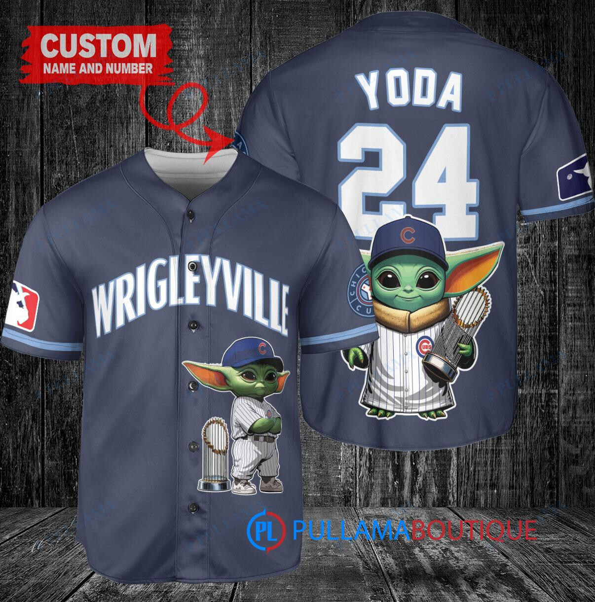 Show off your love for the Chicago Cubs and Baby Yoda with this custom baseball jersey featuring a Star Wars The Mandalorian theme. The navy jersey showcases Baby Yoda holding a trophy, adding a fun and unique twist to your game day outfit. Made with high-quality materials, this jersey is perfect for any Cubs fan who also enjoys the Star Wars universe. Stand out from the crowd and support your favorite team in style with this one-of-a-kind jersey.