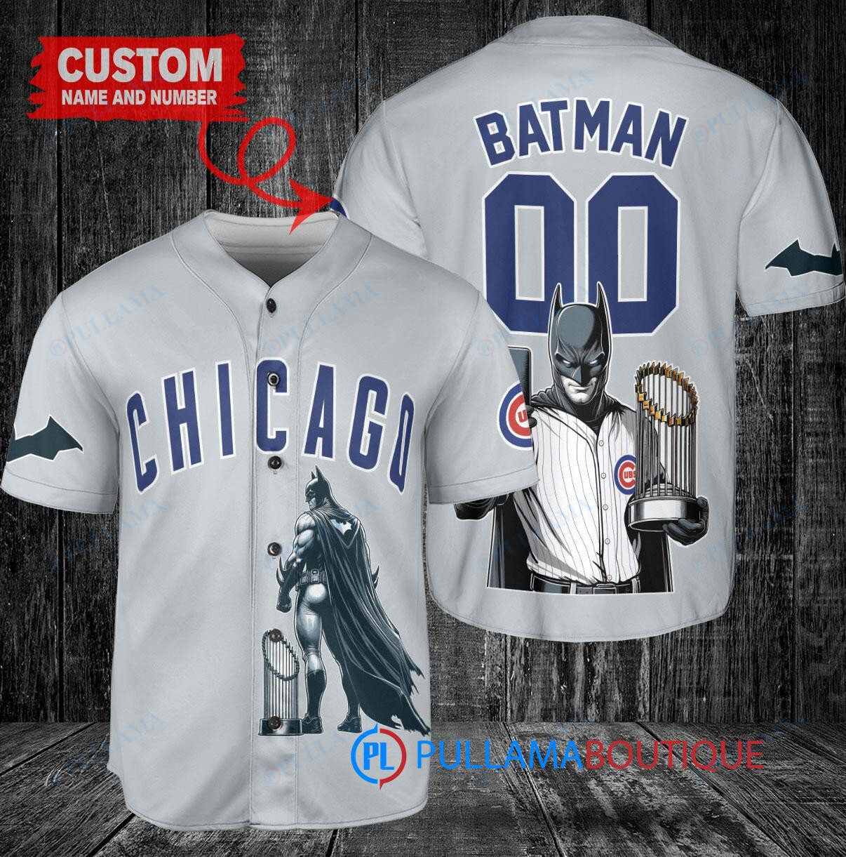 Chicago Cubs x DC Comics Batman The Dark Knight with Trophy Custom Baseball Jersey Gray