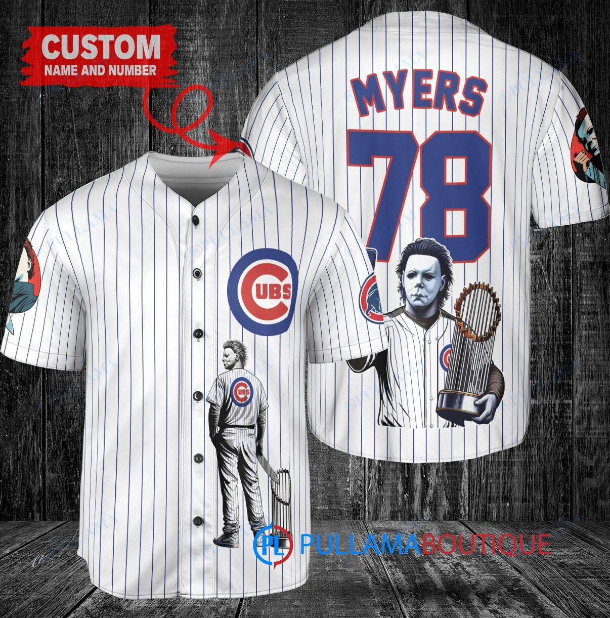Get into the Halloween spirit with this custom Chicago Cubs x Halloween Michael Myers Baseball Jersey. Featuring a spooky Michael Myers design holding a trophy, this white jersey is perfect for any Cubs fan looking to add a festive touch to their game day outfit. Made with high-quality materials, this jersey is sure to be a hit at any Halloween party or baseball game. Add a touch of horror to your wardrobe with this unique and eye-catching jersey.
