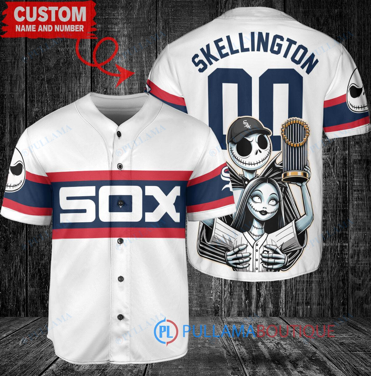Chicago White Sox x Jack Skellington and Sally The Nightmare Before Christmas with World Series Trophy Custom Baseball Jersey White Stripe