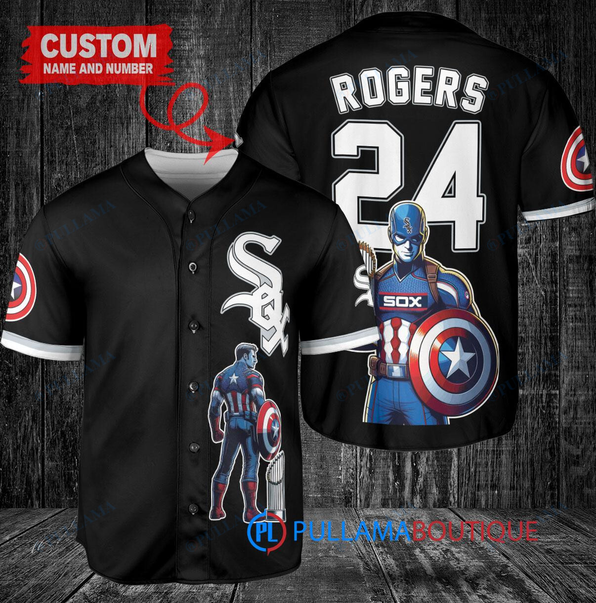 Show your support for the Chicago White Sox and Marvel with this custom baseball jersey featuring Captain America Steve Rogers holding a trophy. The black jersey is perfect for any fan looking to stand out in the crowd. Made with high-quality materials, this jersey is both stylish and comfortable, making it a great addition to any sports memorabilia collection. Get yours today and represent your favorite team and superhero in style!