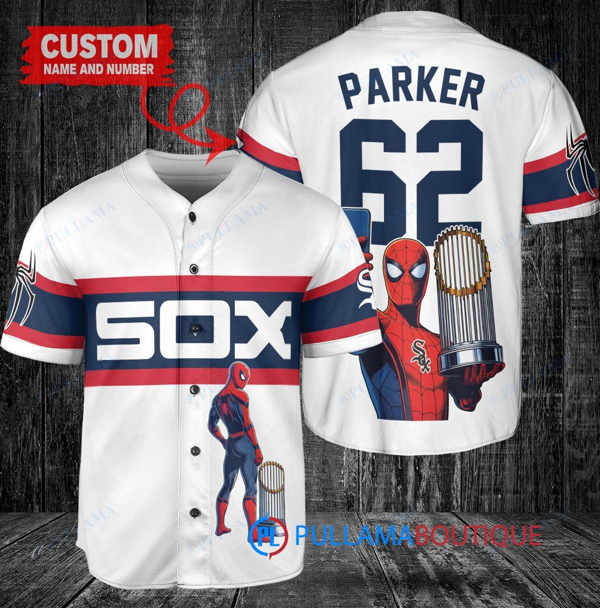Show off your love for the Chicago White Sox and Marvel’s Spiderman with this custom baseball jersey featuring a unique design. The jersey is white with a stripe detail and includes a trophy graphic. Perfect for any baseball fan looking to stand out in the crowd.