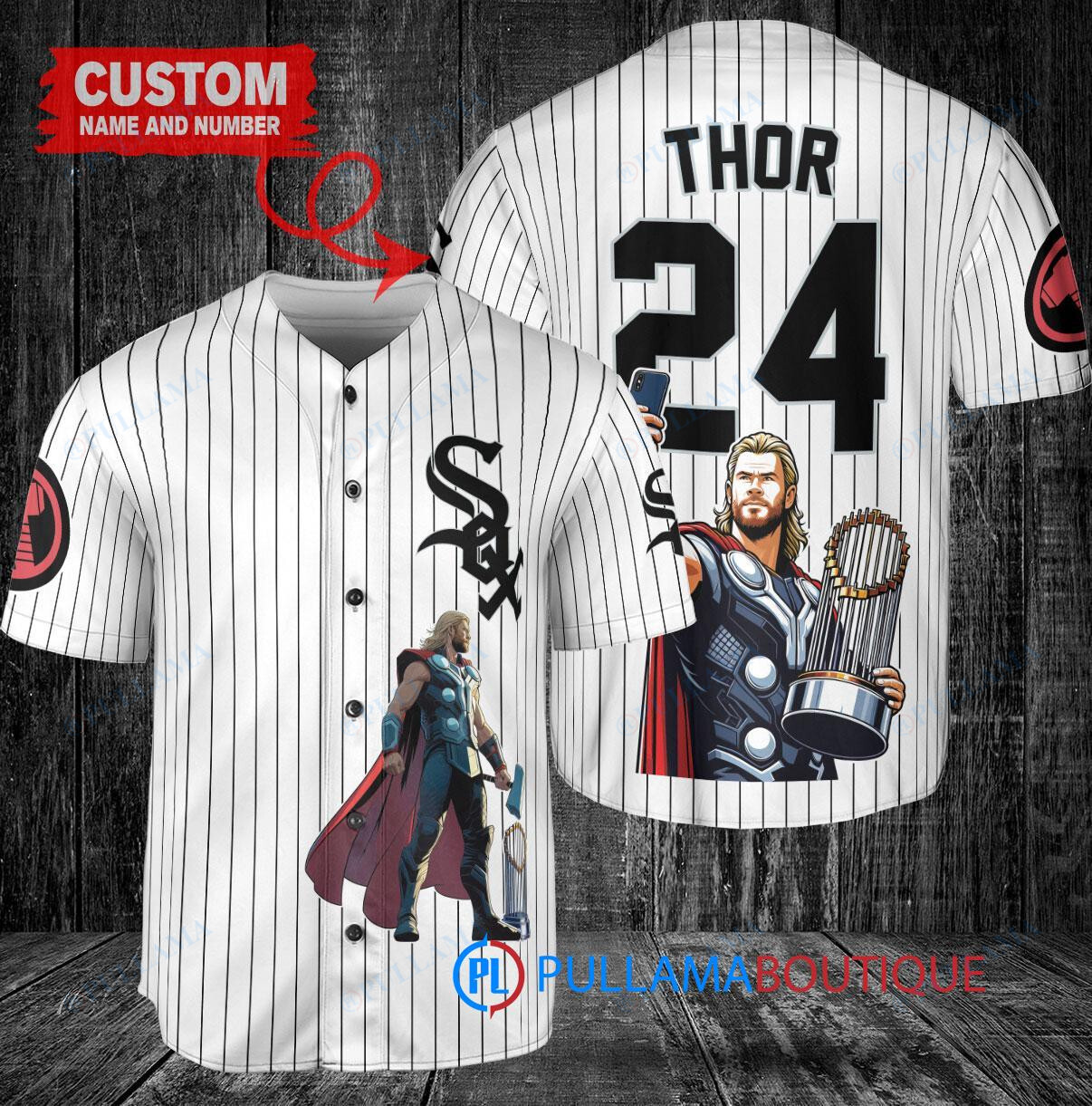 Show off your love for the Chicago White Sox and Thor with this custom baseball jersey featuring a unique design of Thor holding a trophy. This white jersey is perfect for any White Sox fan who also enjoys the Marvel universe. Made with high-quality materials, this jersey is comfortable to wear while cheering on your favorite team or superhero. Add this one-of-a-kind jersey to your collection today!