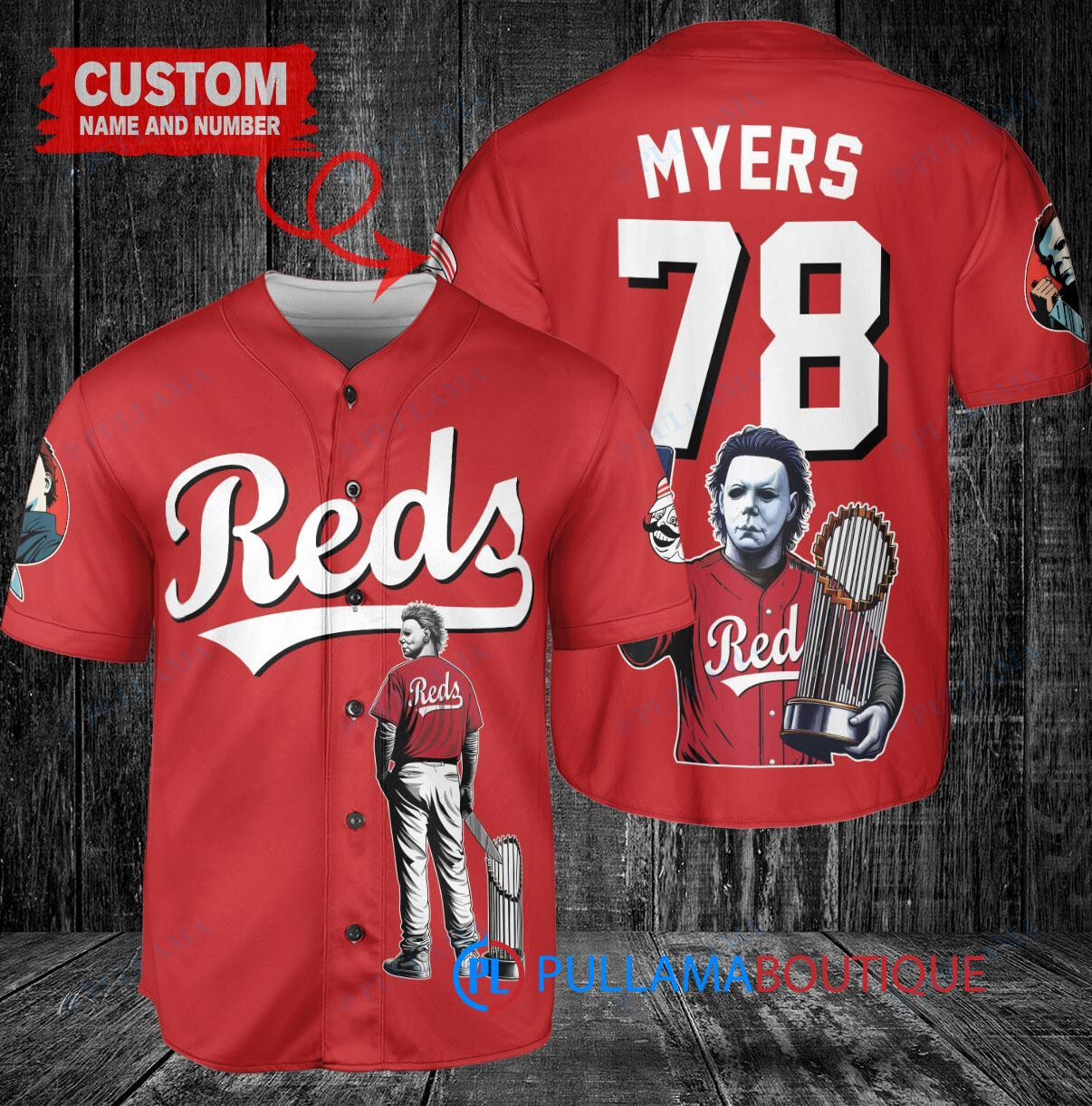 Get into the Halloween spirit with this custom Cincinnati Reds x Halloween Michael Myers Baseball Jersey. The red jersey features a spooky Michael Myers design holding a trophy, perfect for any baseball fan looking to add a touch of horror to their wardrobe. Made with high-quality materials, this jersey is sure to be a standout piece for any Halloween celebration or baseball game.