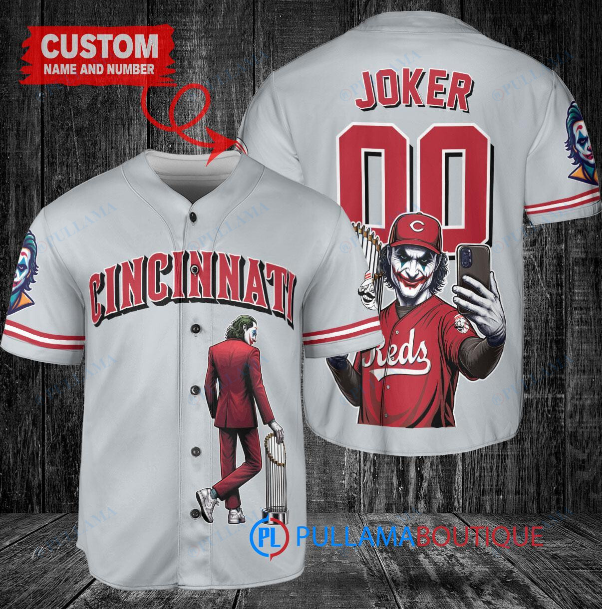 Show off your love for the Cincinnati Reds and the Joker from DC Comics with this custom baseball jersey in gray. The jersey features a unique design with the Joker holding a trophy, perfect for any fan of the team and the iconic comic book character. Made with high-quality materials, this jersey is perfect for wearing to games or just showing off your fandom. Get yours today and stand out from the crowd!