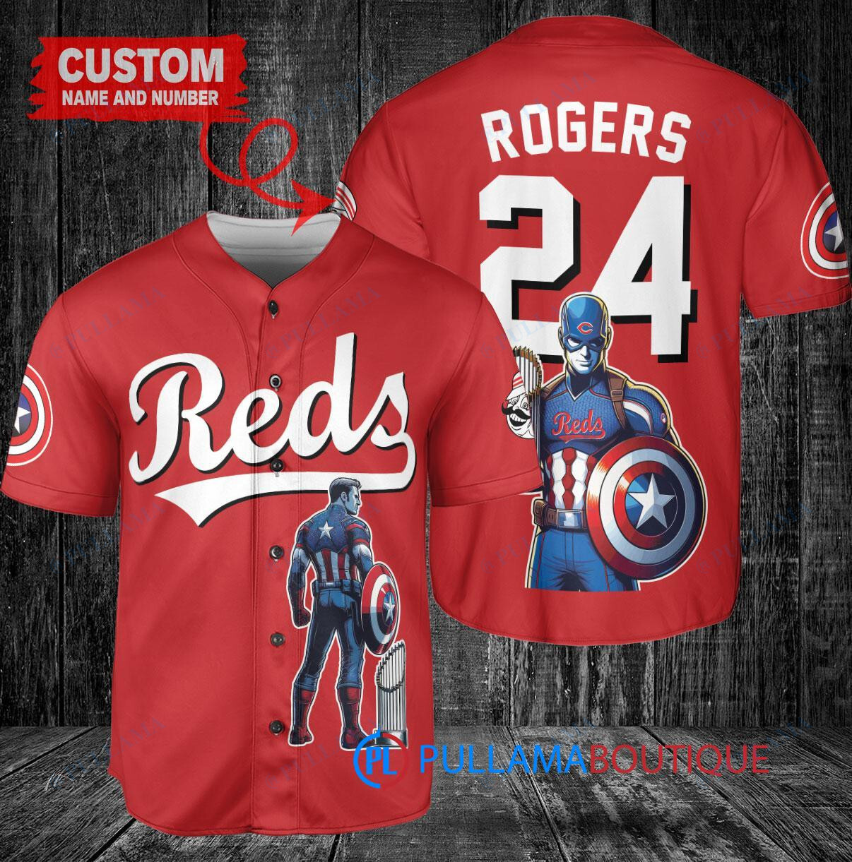Show your support for the Cincinnati Reds with this custom baseball jersey featuring a collaboration with Marvel’s Captain America, Steve Rogers. The jersey is designed in a vibrant red color and includes a trophy graphic, perfect for any baseball fan or Marvel enthusiast. Made with high-quality materials, this jersey is comfortable to wear while showcasing your love for both the Reds and Captain America. Perfect for game days or casual wear, this unique jersey is a must-have for any collector.