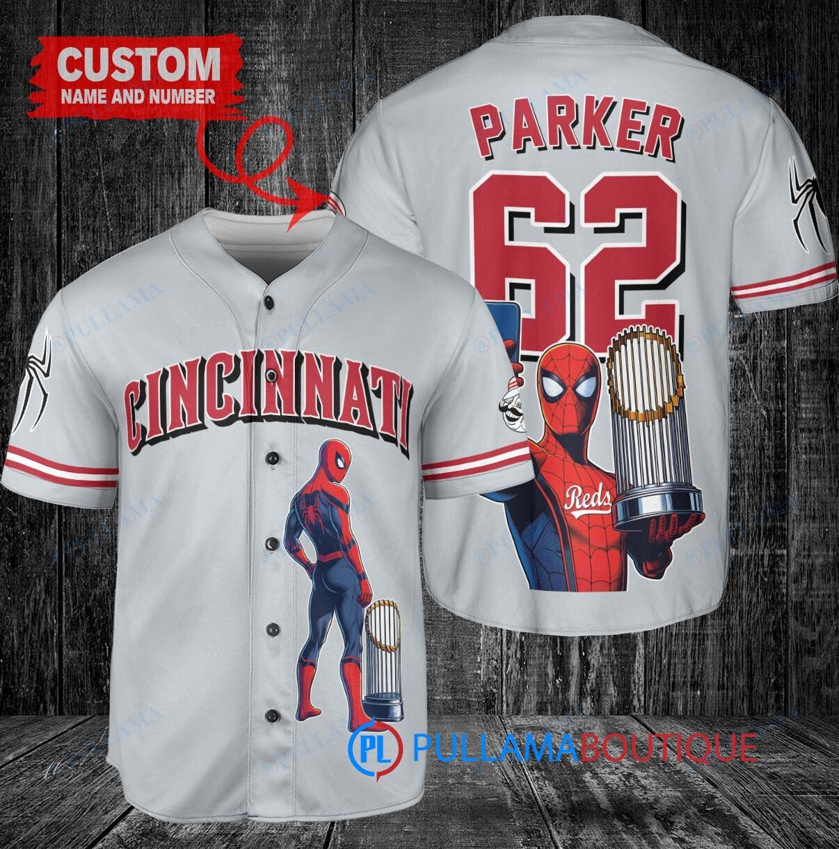 Cincinnati Reds x Marvel Spiderman with Trophy Custom Baseball Jersey Gray