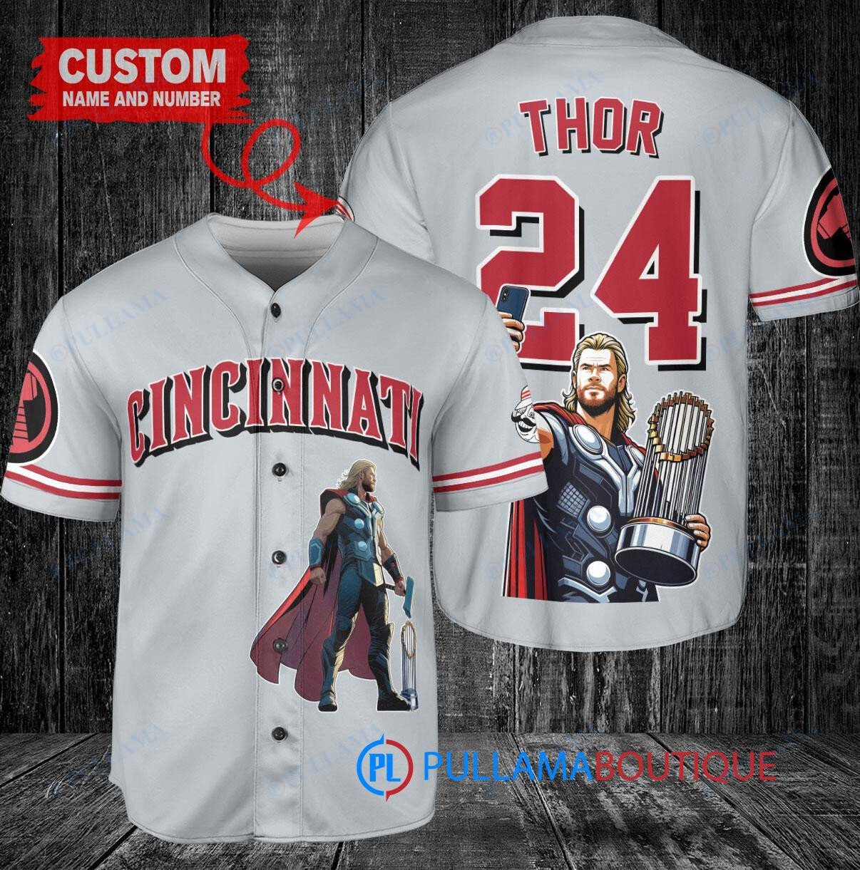 Show off your love for the Cincinnati Reds and Thor Marvel with this custom baseball jersey in gray. This jersey features a unique design with the Thor Marvel character holding a trophy, perfect for any fan of the team and the superhero. Made with high-quality materials, this jersey is comfortable to wear while showing off your unique style. Perfect for game days or casual wear, this jersey is a must-have for any Cincinnati Reds and Thor Marvel fan.