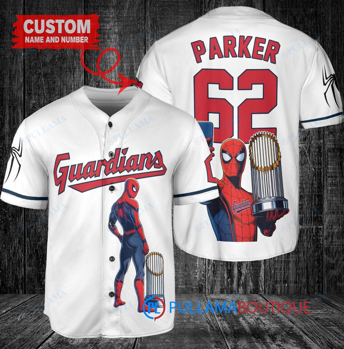 Cleveland Guardians x Marvel Spiderman with Trophy Custom Baseball Jersey White