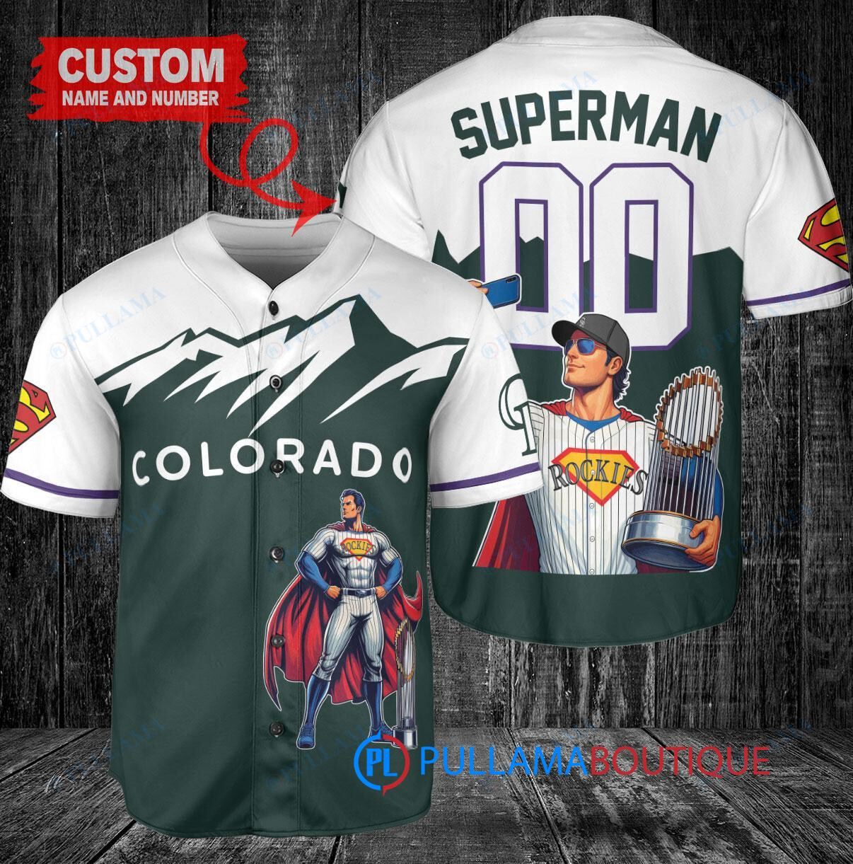 Show off your love for the Colorado Rockies and Superman with this custom baseball jersey featuring a unique DC Comics design. The jersey is green in color and includes a trophy graphic, perfect for any fan looking to stand out in the crowd. Made with high-quality materials, this jersey is a must-have for any baseball enthusiast.