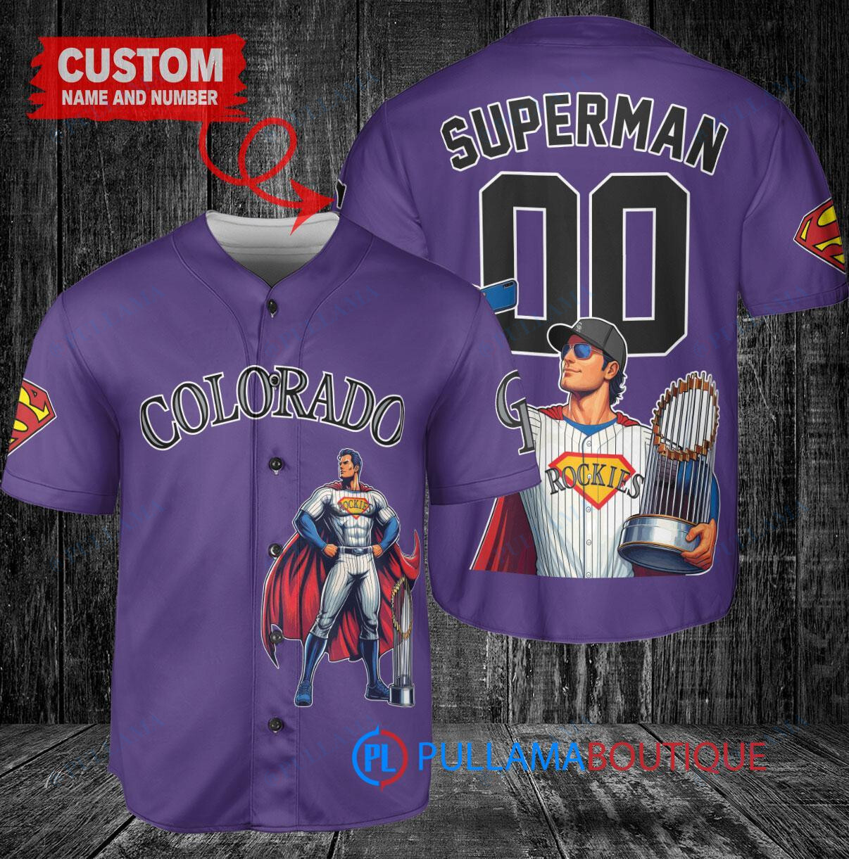 Show off your love for the Colorado Rockies and Superman with this custom baseball jersey featuring a unique DC Comics design. The jersey is purple in color and includes a trophy graphic, perfect for any fan looking to stand out in the crowd. Made with high-quality materials, this jersey is both stylish and comfortable, making it a great addition to any fan’s collection. Whether you’re at the game or just out and about, this jersey is sure to turn heads and show off your team spirit.
