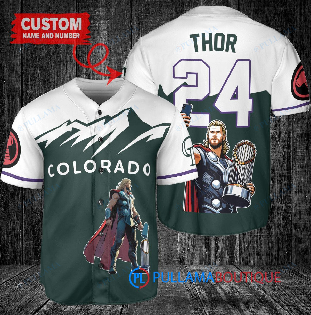 Show off your love for the Colorado Rockies and Thor Marvel with this custom baseball jersey in green. Featuring a unique design with a trophy graphic, this jersey is perfect for any fan looking to stand out in the crowd. Made with high-quality materials, this jersey is comfortable to wear while cheering on your favorite team. Get yours today and show your support in style!