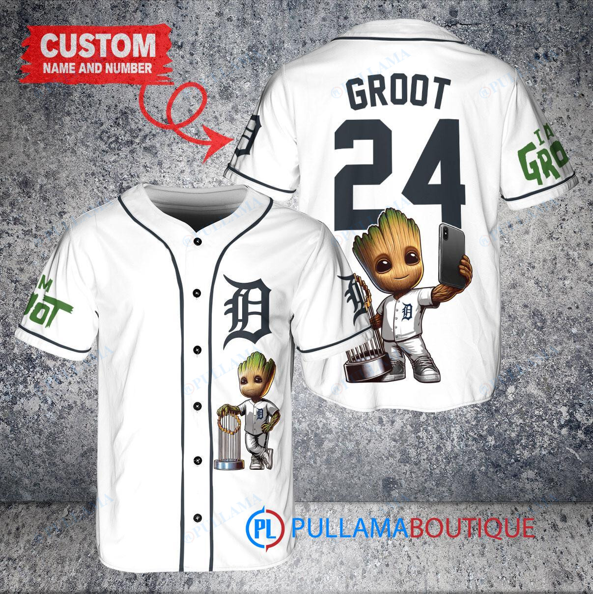 Show off your love for the Detroit Tigers and Marvel’s Guardians of the Galaxy with this custom baseball jersey featuring Baby Groot holding a trophy. This white jersey is perfect for any fan looking to stand out in the crowd. Made with high-quality materials, this jersey is both stylish and comfortable, making it a great addition to any sports fan’s wardrobe. Whether you’re heading to the game or just hanging out with friends, this jersey is sure to turn heads. Get yours today and show your support for your favorite team and superhero!