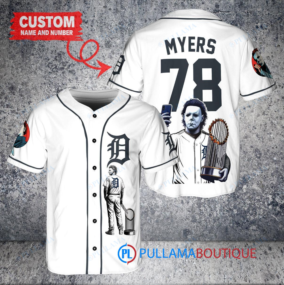 Get into the Halloween spirit with this custom Detroit Tigers x Halloween Michael Myers Baseball Jersey. Featuring a unique design of Michael Myers holding a trophy, this white jersey is perfect for any Tigers fan looking to stand out. Made with high-quality materials, this jersey is comfortable to wear while showing off your team pride. Perfect for Halloween or any game day, this jersey is a must-have for any Tigers fan.