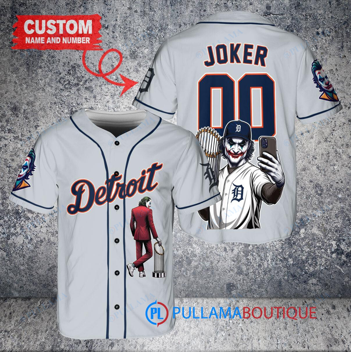 Show off your love for the Detroit Tigers and the Joker from DC Comics with this custom baseball jersey in gray. Featuring a unique design with the Joker holding a trophy, this jersey is perfect for any fan looking to stand out in the crowd. Made with high-quality materials, this jersey is both stylish and comfortable, making it a great addition to any fan’s collection. Whether you’re at the game or just hanging out with friends, this jersey is sure to turn heads. Get yours today and show your support in style!