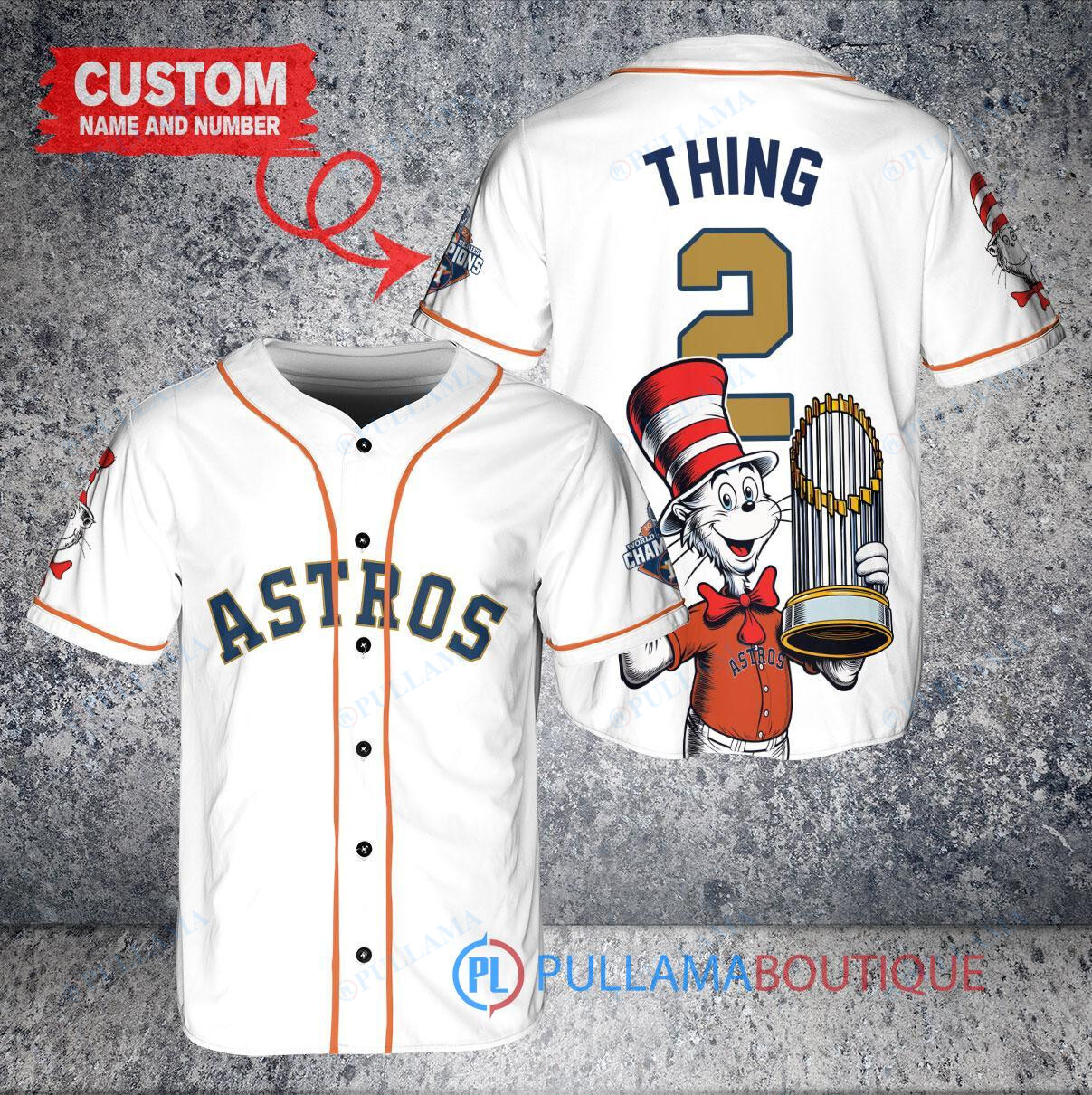 Show your love for the Houston Astros in a fun and unique way with this custom baseball jersey featuring a Dr. Seuss design and the World Series Trophy. This white jersey is perfect for any Astros fan looking to stand out in the crowd. Made with high-quality materials, this jersey is comfortable to wear while showing off your team pride. Get ready to cheer on the Astros in style with this one-of-a-kind jersey!