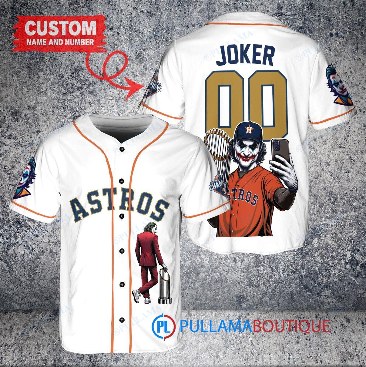 Show off your love for the Houston Astros and the Joker from DC Comics with this custom baseball jersey. The white jersey features a unique design with the Joker holding a trophy, perfect for fans of both the team and the iconic comic book character. Made with high-quality materials, this jersey is a must-have for any baseball fan looking to stand out in the crowd. Get yours today and hit a home run with your style!