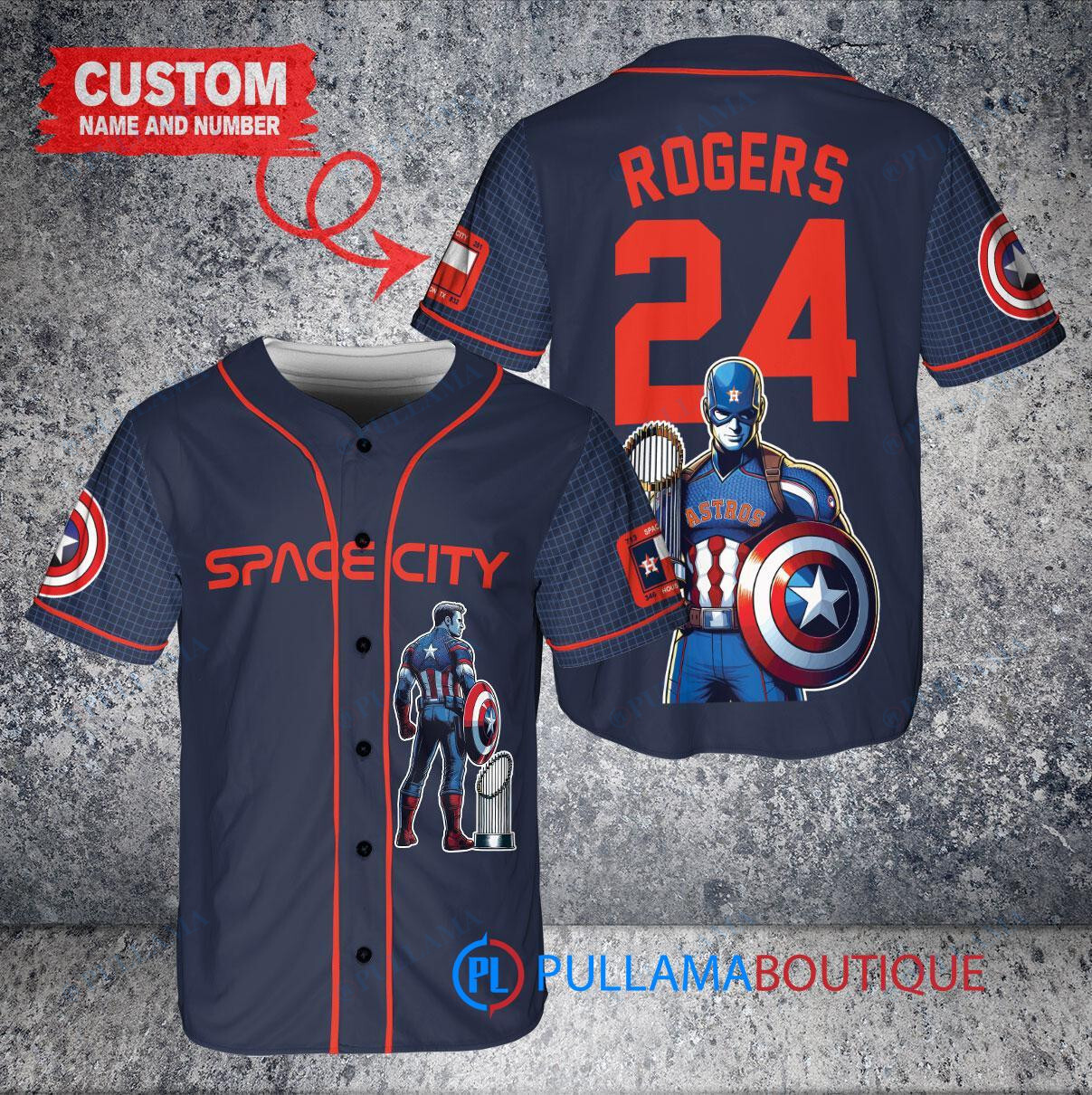 Show your support for the Houston Astros with this custom baseball jersey featuring Marvel’s Captain America Steve Rogers. This navy City Connect jersey is perfect for any fan looking to stand out in the crowd. Made with high-quality materials, this jersey is designed to be comfortable and durable. Get your hands on this unique piece and represent your favorite team in style!