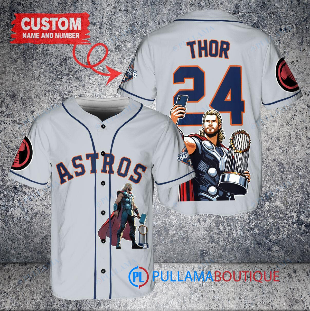 Show off your love for the Houston Astros and Thor with this custom baseball jersey in gray. Featuring a unique design of Thor from Marvel holding a trophy, this jersey is perfect for any fan looking to stand out in the crowd. Made with high-quality materials, this jersey is comfortable to wear while showing off your favorite team and superhero. Get yours today and hit a home run with style!