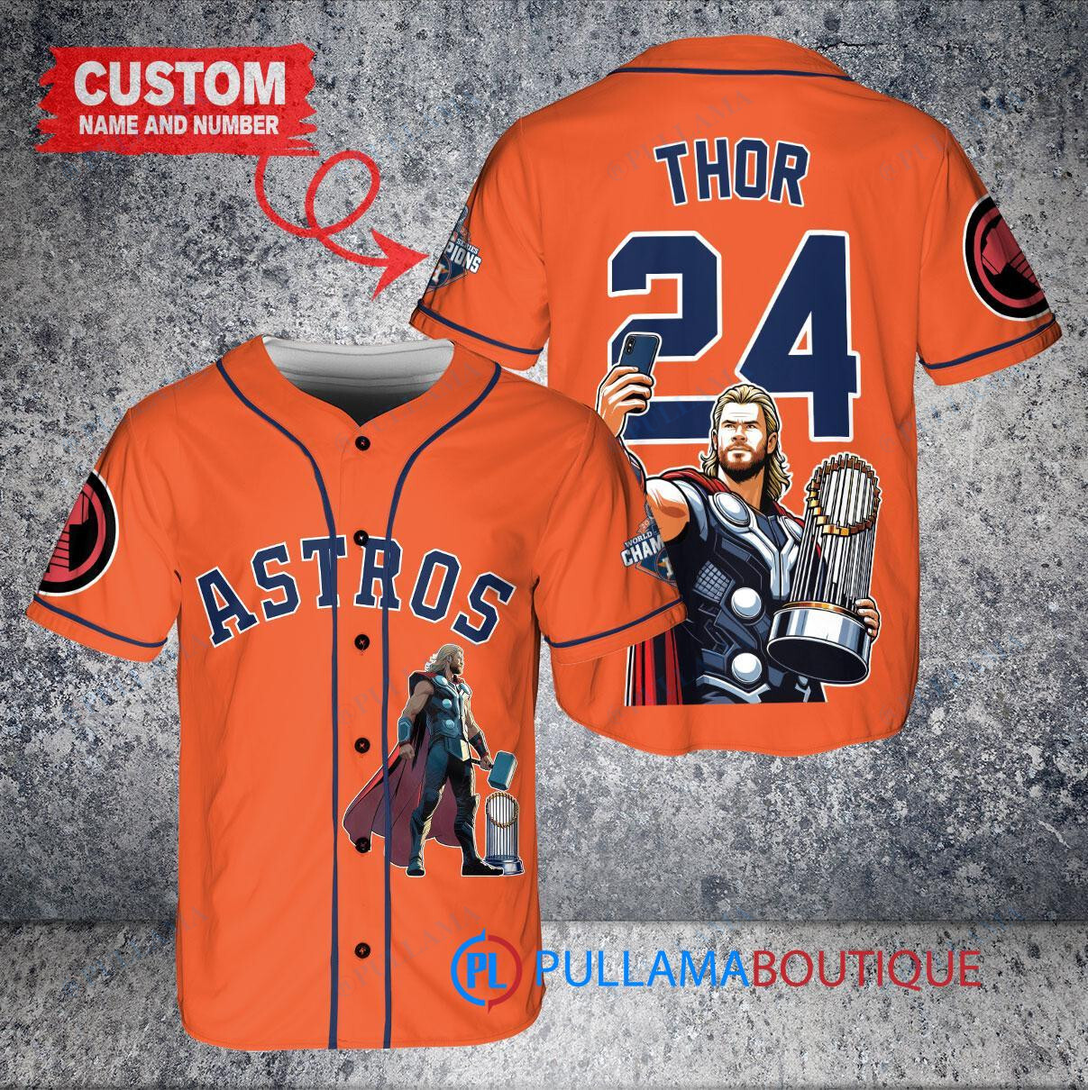 Show off your love for the Houston Astros and Thor with this custom baseball jersey in vibrant orange. Featuring a unique design of Thor from Marvel holding a trophy, this jersey is perfect for any fan looking to stand out in the crowd. Made with high-quality materials, this jersey is comfortable to wear while cheering on your favorite team. Get yours today and show your support in style!