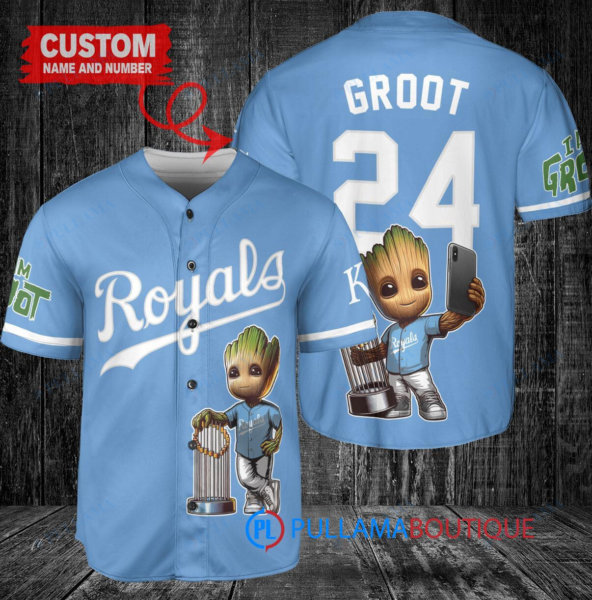Show off your love for the Kansas City Royals and Marvel’s Guardians of the Galaxy with this custom baseball jersey featuring Baby Groot holding a trophy. The light blue jersey is perfect for any fan looking to stand out in the crowd. Made with high-quality materials, this jersey is both stylish and comfortable, making it a great addition to your sports memorabilia collection. Get ready to cheer on your favorite team in style with this unique and eye-catching jersey.