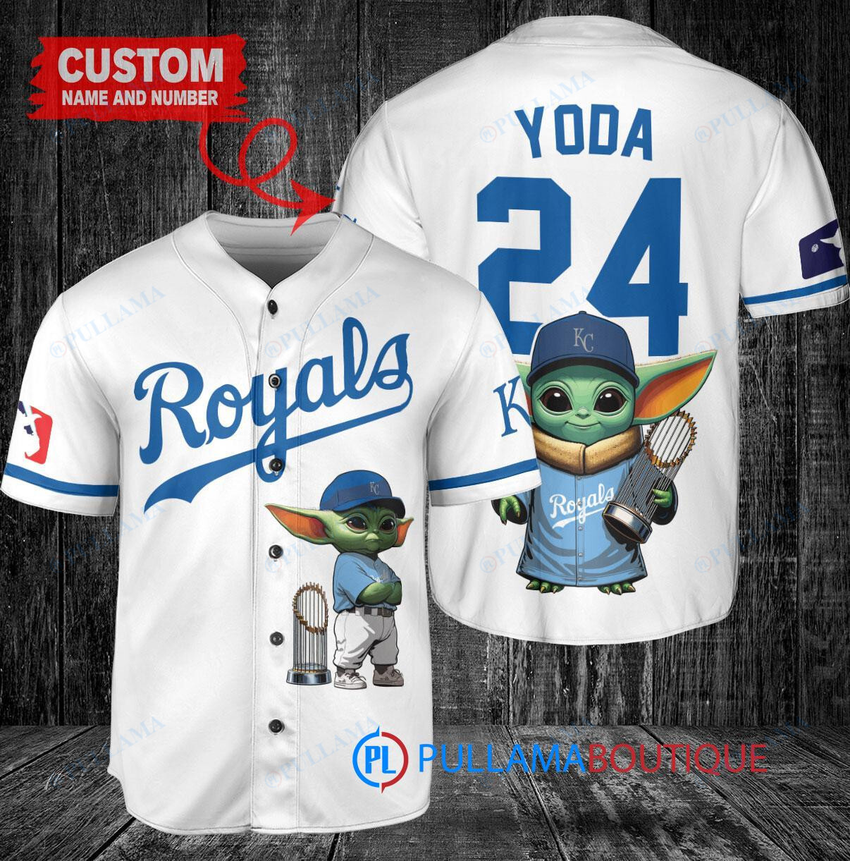 Show off your love for the Kansas City Royals and Baby Yoda from Star Wars: The Mandalorian with this custom baseball jersey. The white jersey features a unique design with Baby Yoda holding a trophy, perfect for any fan of the team and the popular TV series. Made with high-quality materials, this jersey is a must-have for any baseball and Star Wars enthusiast. Stand out from the crowd and add this special piece to your collection today!