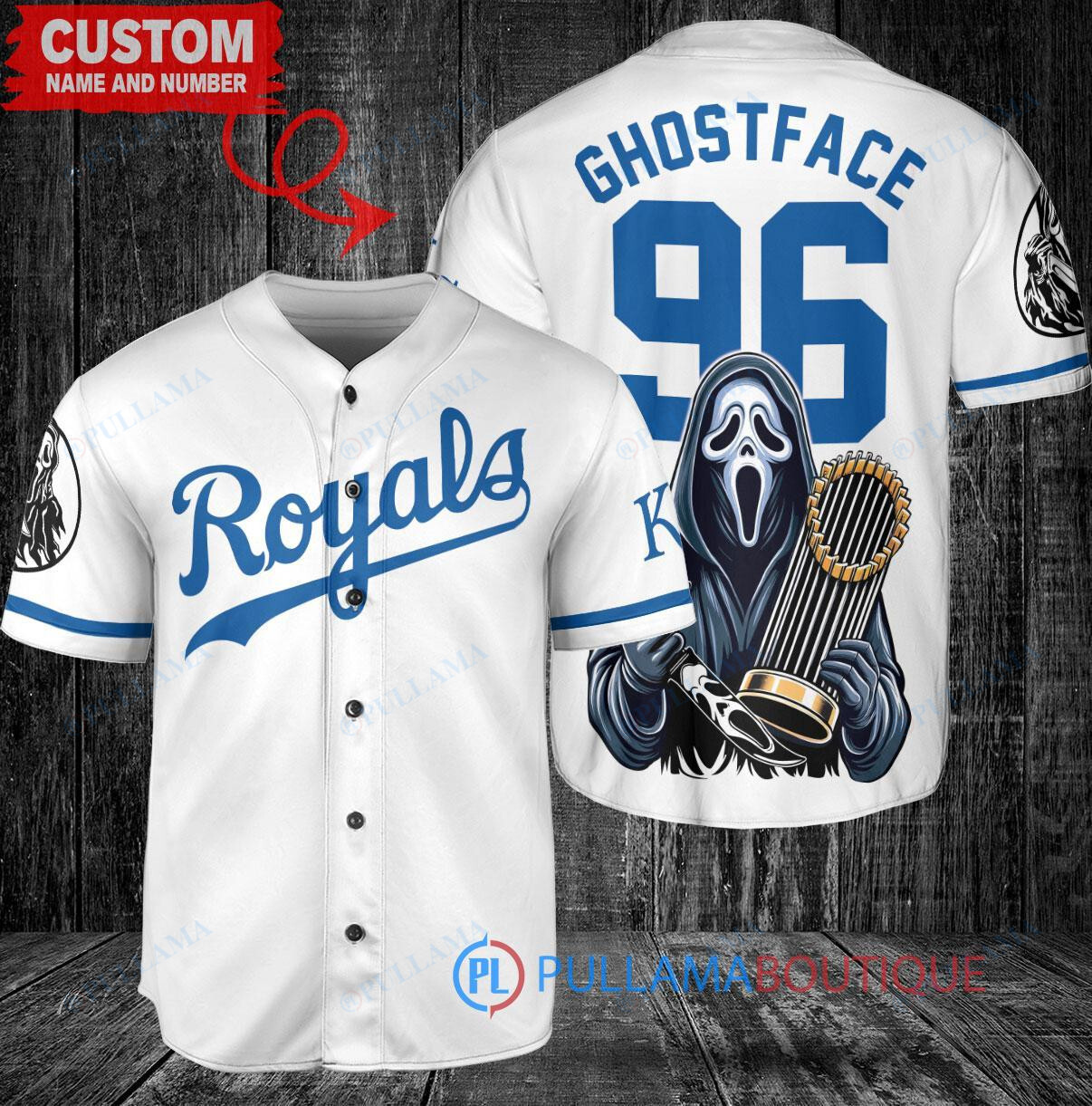 Get into the Halloween spirit with this custom Kansas City Royals x Ghostface Scream Halloween Baseball Jersey. Featuring a unique design with the World Series Trophy, this white jersey is perfect for any baseball fan looking to show off their team pride during the spooky season. Made with high-quality materials, this jersey is sure to be a hit at any Halloween party or game day event. Add a touch of fright to your baseball wardrobe with this one-of-a-kind jersey!