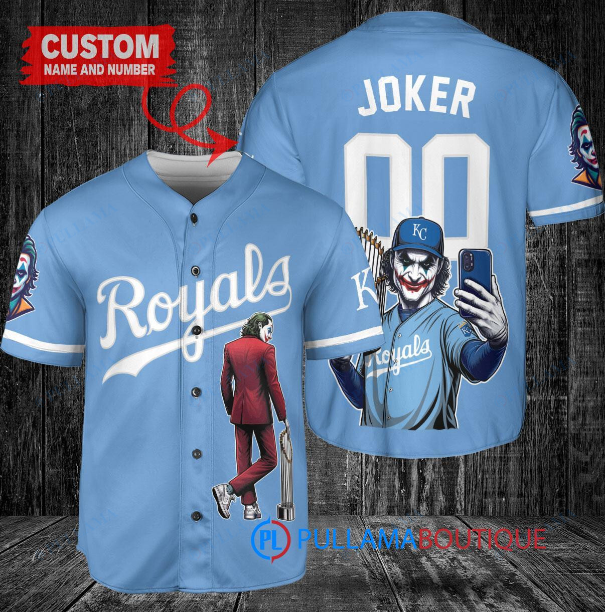 Show off your love for the Kansas City Royals and the Joker from DC Comics with this custom baseball jersey in light blue. This unique jersey features a trophy design, perfect for any fan looking to stand out in the crowd. Made with high-quality materials, this jersey is both stylish and comfortable, making it a great addition to any fan’s collection. Whether you’re at the game or just hanging out with friends, this jersey is sure to turn heads. Get yours today and show your support in style!
